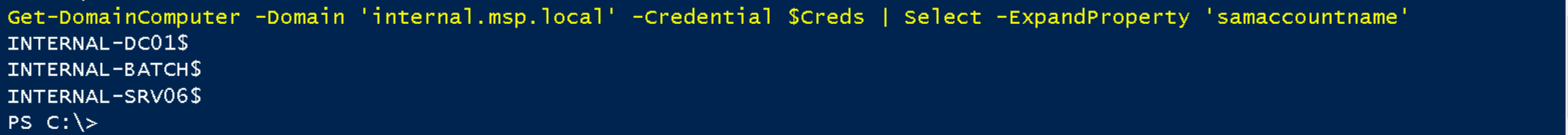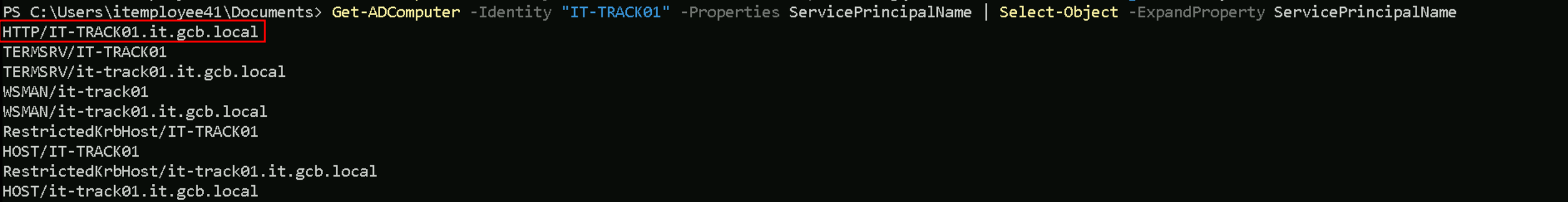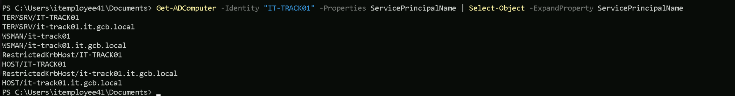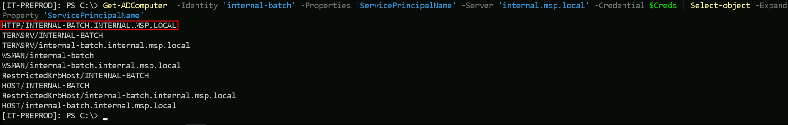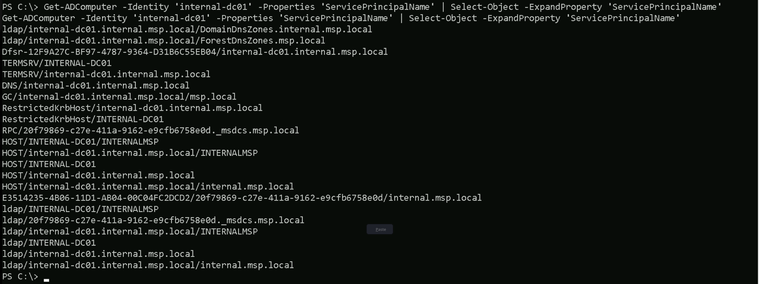 Get-ADComputer -Identity 'internal-dc01' -Properties 'ServicePrincipalName' | Select-Object -ExpandProperty 'ServicePrincipalName'