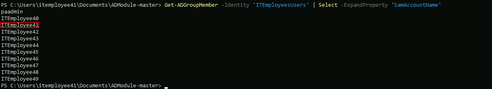 Get-ADGroupMember -Identity 'ITEmployeesUsers' | Select -ExpandProperty 'SamAccountName'