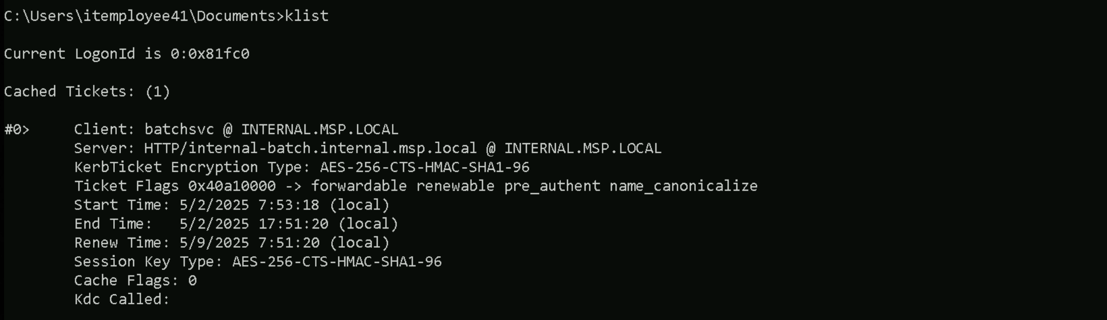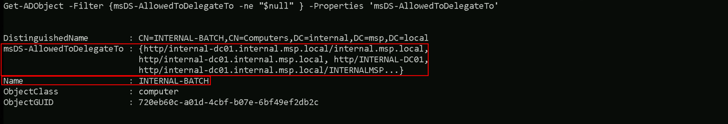 What we’re seeing is that our compromised machine, INTERNAL-BATCH$, has delegation rights defined in the msDS-AllowedToDelegateTo attribute, which includes entries for HTTP/internal-dc01. This means we are explicitly permitted to delegate to that SPN.
