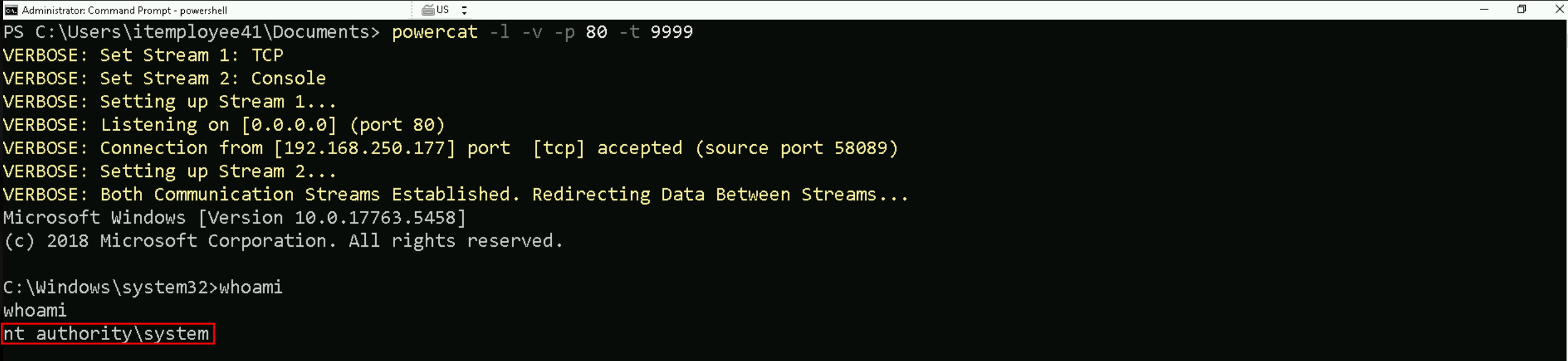 We will do it by creating a scheduled service and start it right after. I tried several way via Powershell but for some reason that I can’t explain it did not work, so I had to import nc.exe into the machine and make SYSTEM to execute it and access to our IP.