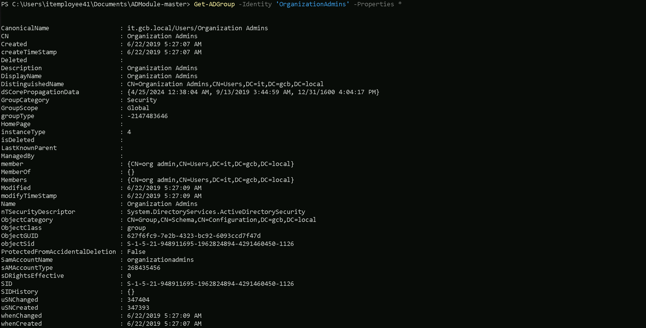 Get-ADGroup -Identity 'OrganizationAdmins' -Properties *