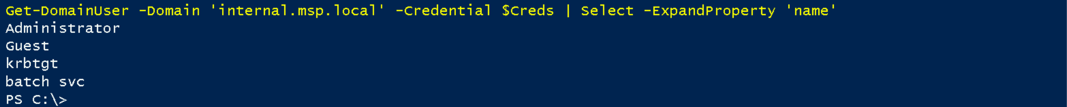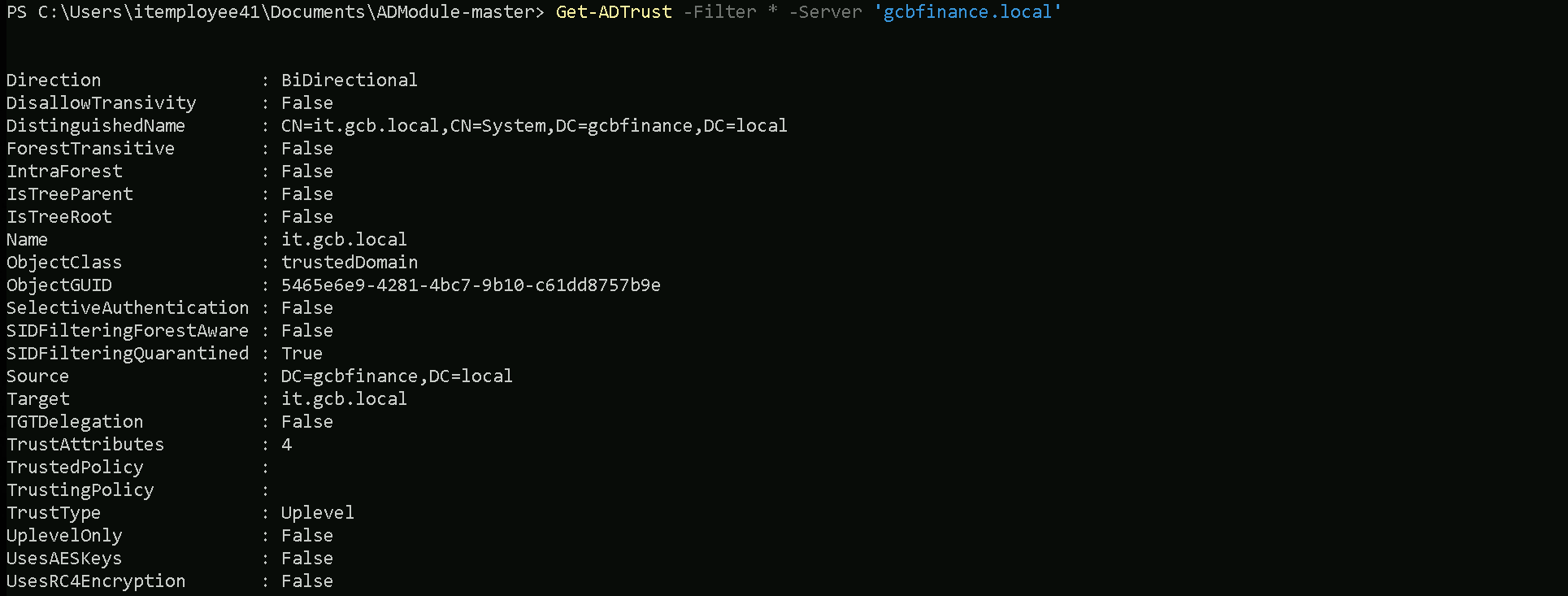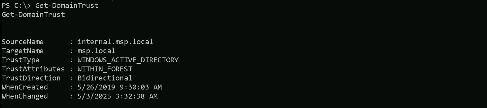 From what we see in your Get-DomainTrust output, we have identified a bidirectional trust relationship between internal.msp.local (our current domain) and msp.local. This is a Windows Active Directory trust classified as within-forest, meaning both domains are part of the same forest and can share resources and authentication seamlessly in both directions.