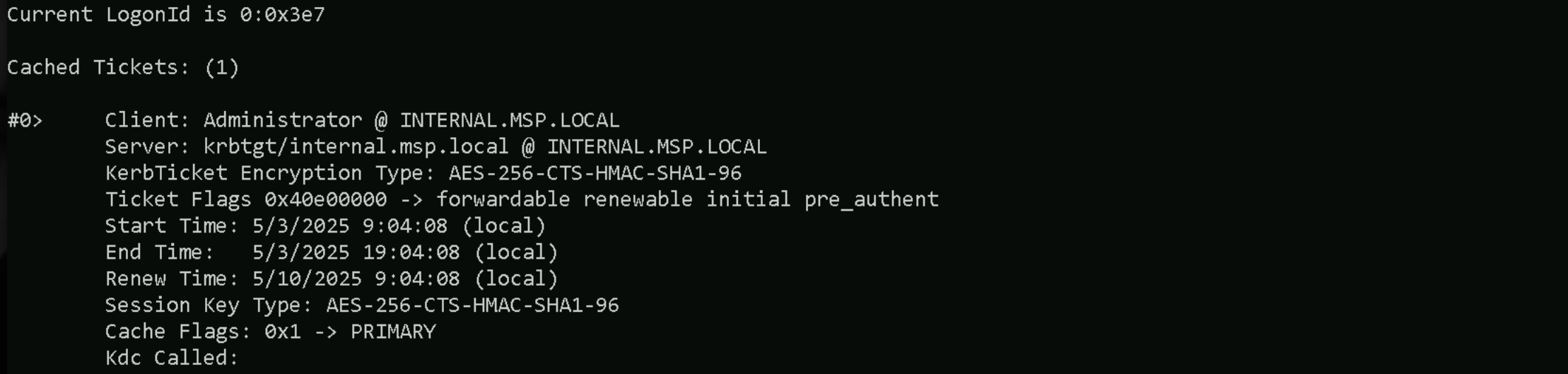 Now that we were able to add internalmsp\administrator into BUILTIN\ADMINISTRATOR group inside msp-dc01.msp.local. We can simly get into a machine that we have compromised already inside msp.local domain and request the Administrator’s TGT.