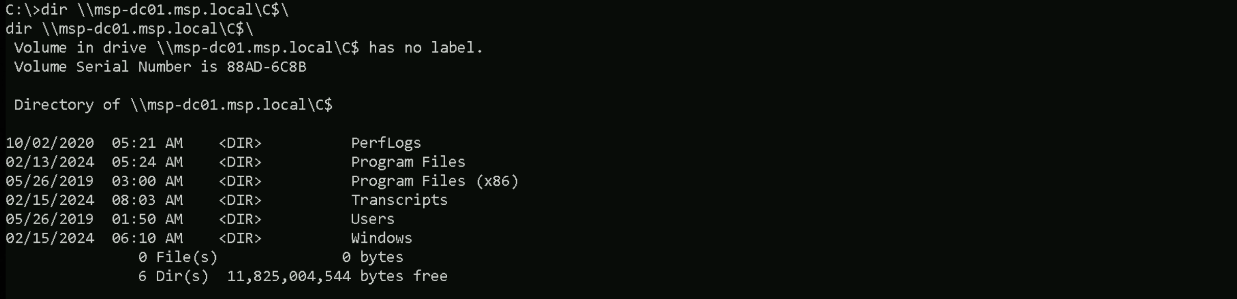 If we enumerate the MSP-DC01 shares, we will be able to do so simply using dir command remotely.