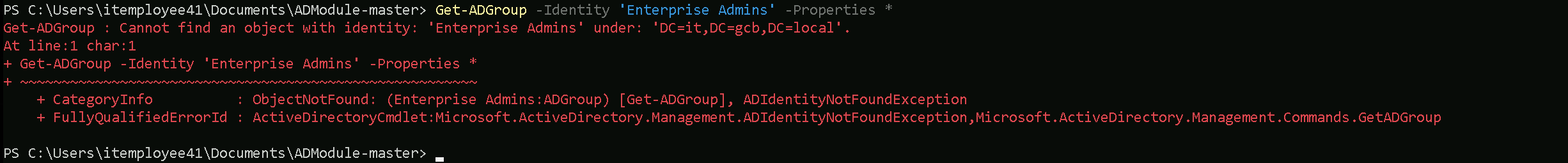 The explanation above is the reason why we do receive the error when we tried to enumerate the enterprise Admins group, we are inside a child domain it.gcb.local.