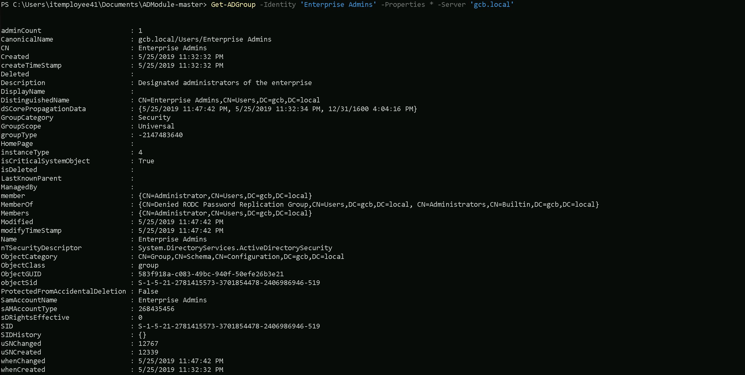 Get-ADGroup -Identity 'Enterprise Admins' -Properties * -Server 'gcb.local'