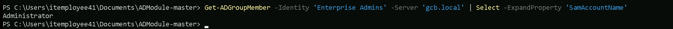 Get-ADGroupMember -Identity 'Enterprise Admins' -Server 'gcb.local' | Select -ExpandProperty 'SamAccountName'