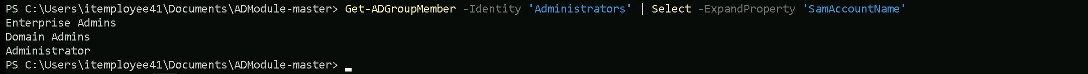 Get-ADGroupMember -Identity 'Administrators' | Select -ExpandProperty 'SamAccountName’