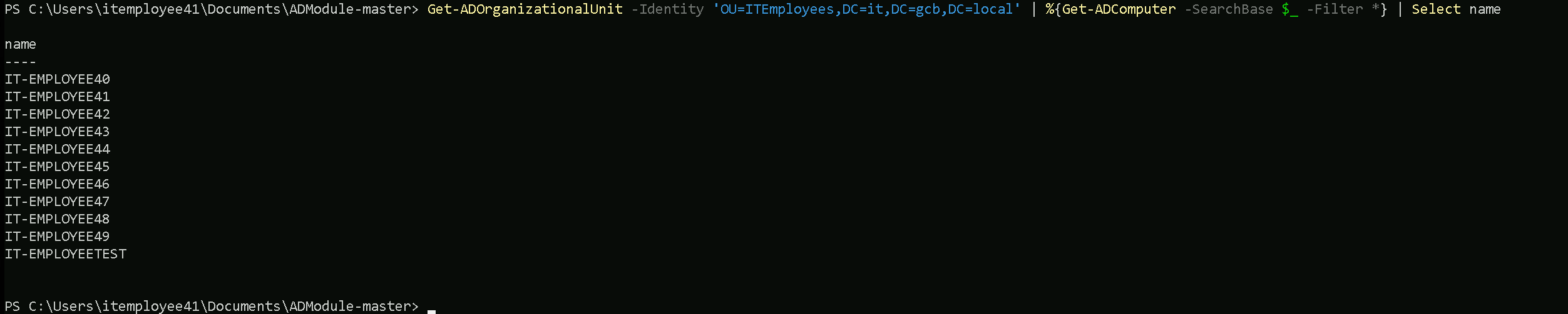 Get-ADOrganizationalUnit -Identity 'OU=ITEmployees,DC=it,DC=gcb,DC=local' | %{Get-ADComputer -SearchBase $_ -Filter *} | Select name