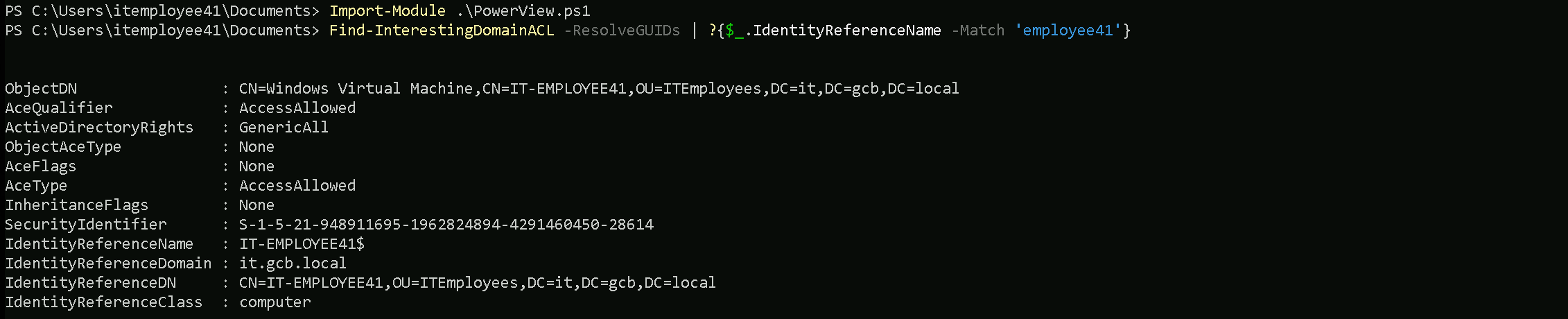 Instead of enumerating the each ACLs on the domain, I decided to do it differently. I decided to use Find-InterestingDomainACL which is a module from PowerView that allows us to verify really interesting ACLs by passing the user or even groups as well. For example, it will show us if a specific user or group itself have some interesting ACLs like GenericAll, GenericWrite, etc over an Object.
