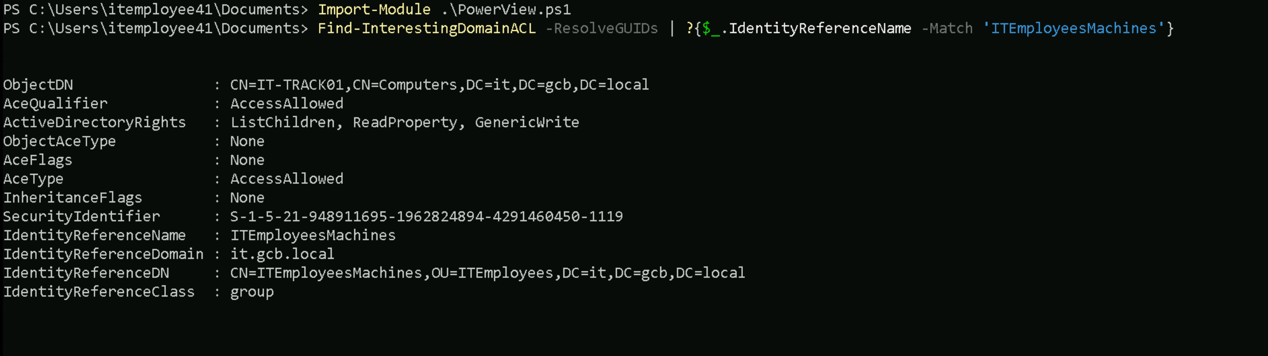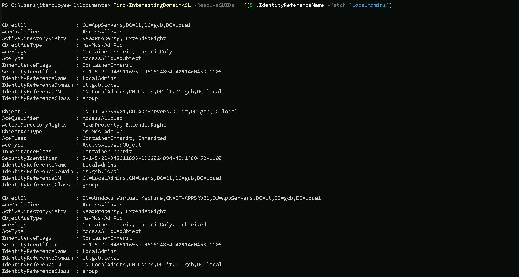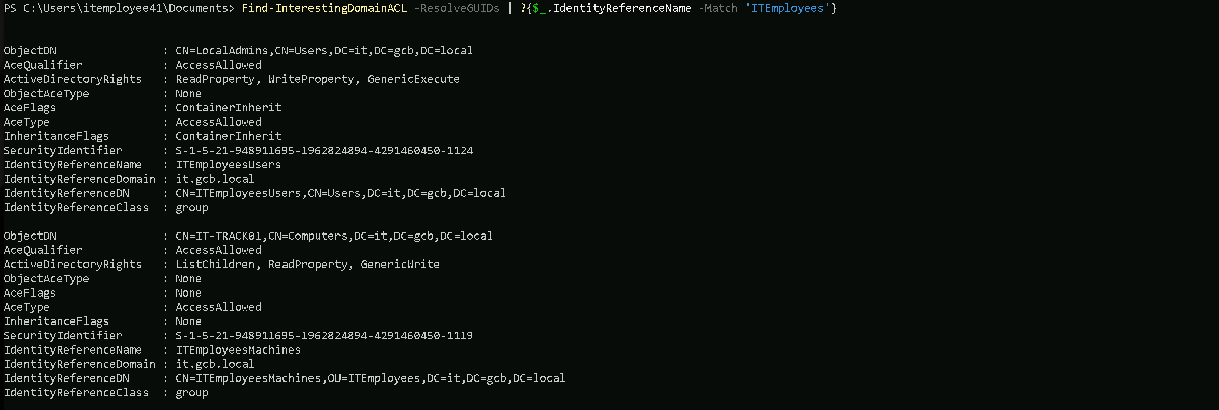 Find-InterestingDomainACL -ResolveGUIDs -Verbose