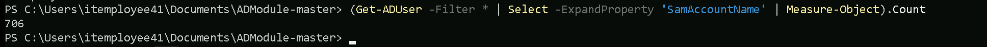 As it is possible to see, we do have a huge number of users inside the current domain. if we really want to know the total number of users inside this domain, we can use the Measure-Object and this will count and deliver the total number of users.