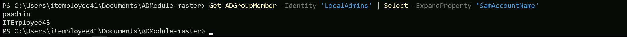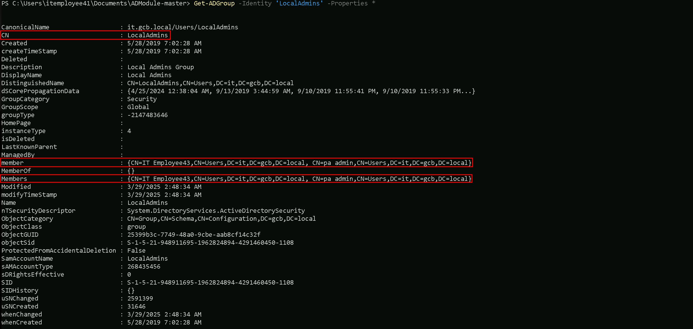Using the Get-ADGroupMember we can also enumerate and confirm members (User/Computer) that belong to LocalAdmins group.