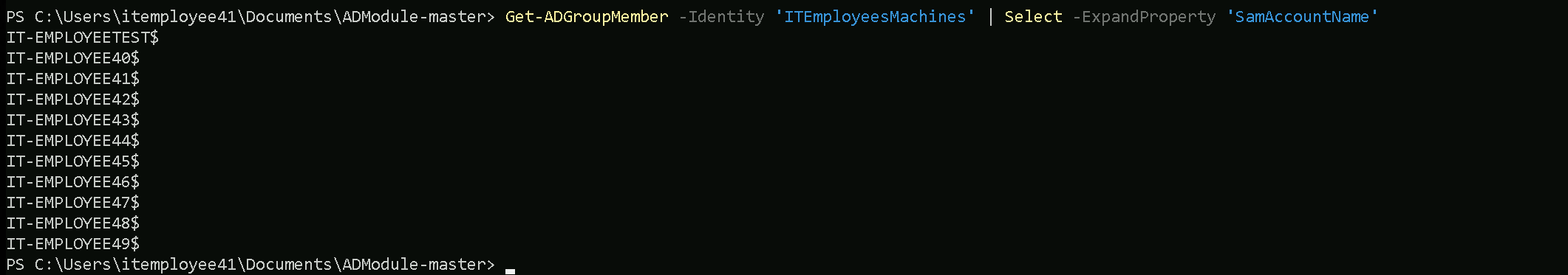 Get-ADGroupMember -Identity 'ITEmployeesMachines' | Select -ExpandProperty 'SamAccountName'