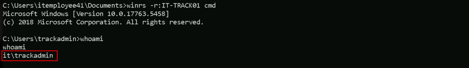 Now that we do have injected the TrackAdmin’s TGT into the new CMD, we can now access IT-TRACK01 and we will use WinRS.