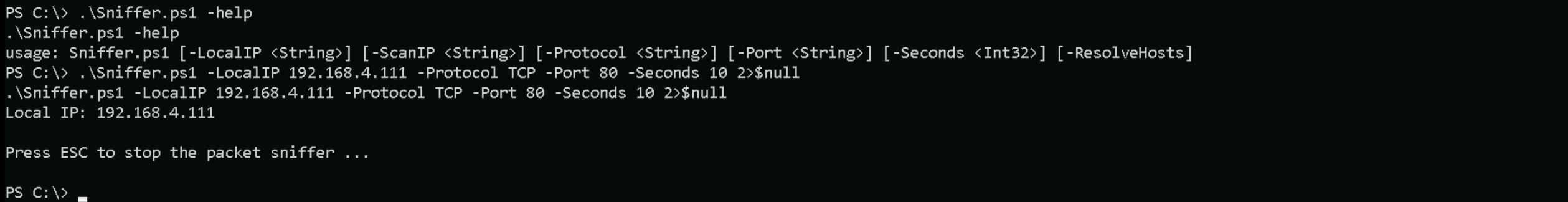 Let’s now start sniffing the traffic, for at least 60 seconds..\Sniffer.ps1 -LocalIP 192.168.4.111 -Protocol TCP -Port 80 -Seconds 60 2>$null