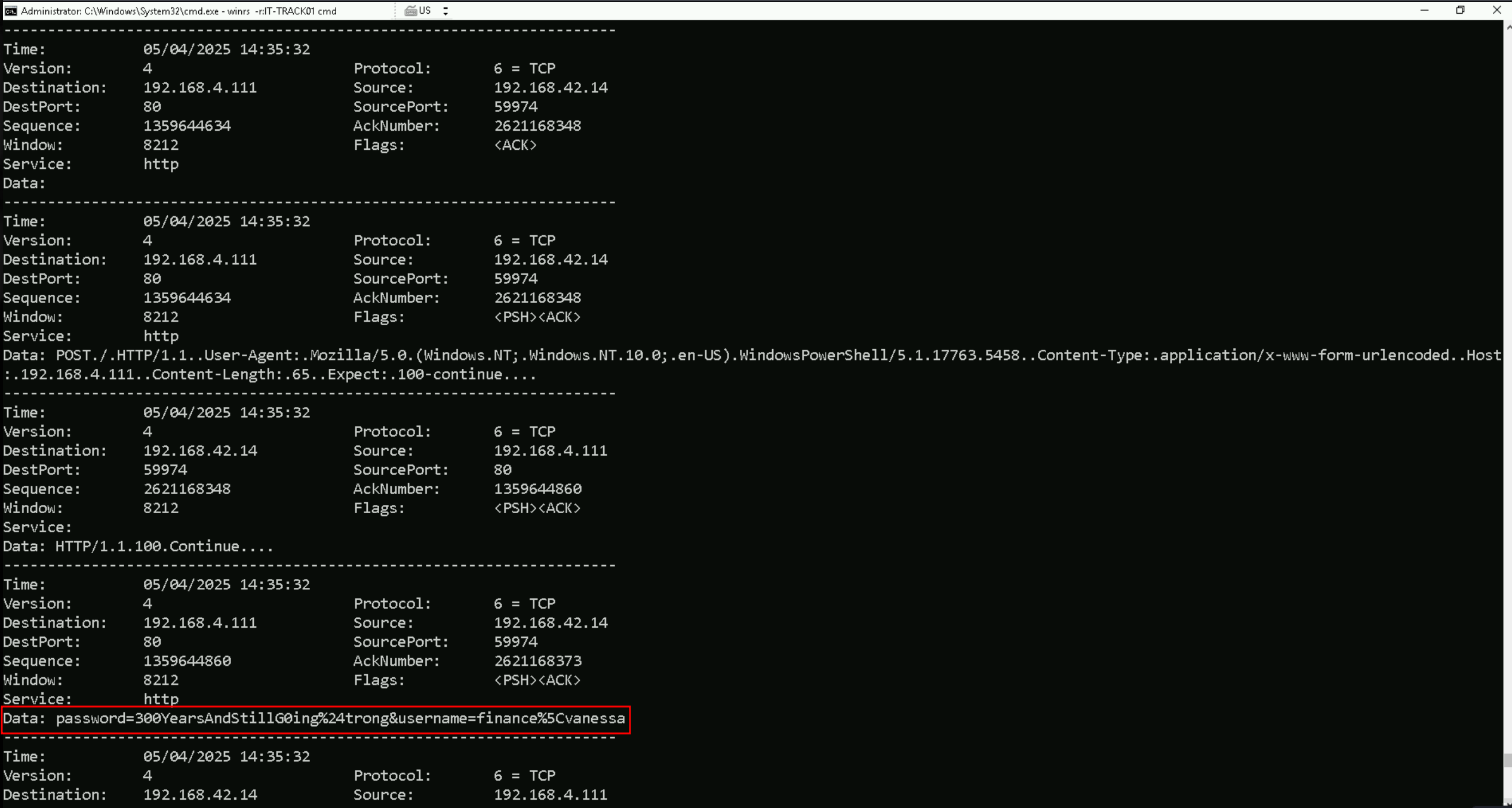 If we check properly, we are able to find this raw sniff strings credentials: password=300YearsAndStillG0ing%24trong&username=finance%5Cvanessa