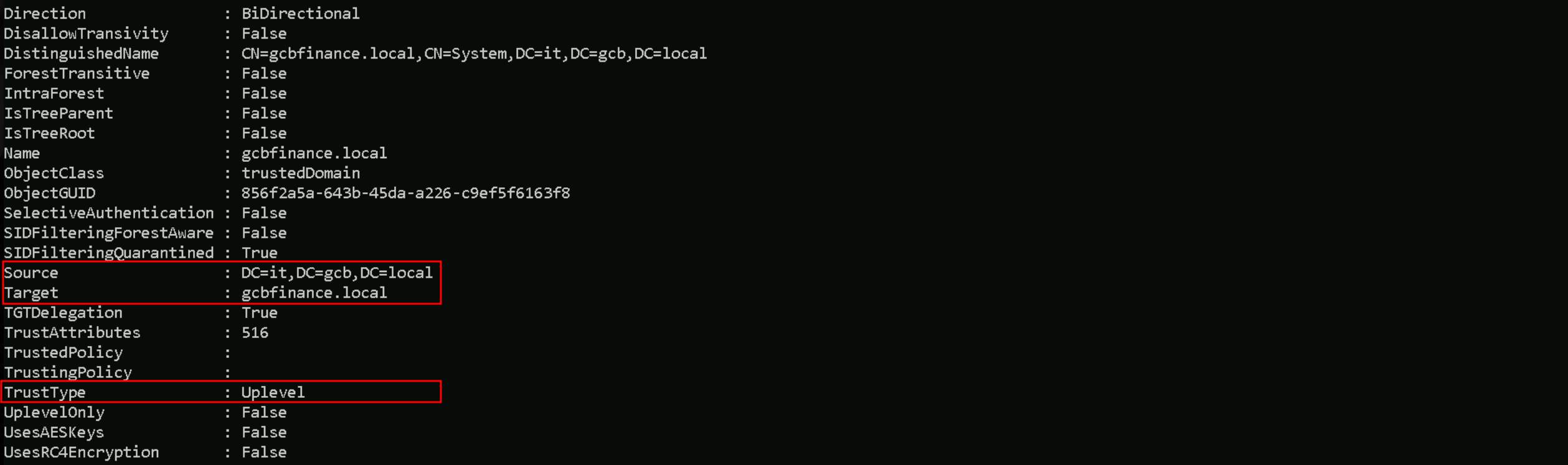 We can see above that, we do have a Bidirectional Trust between it.gcb.local and gcbfinance.local domain.