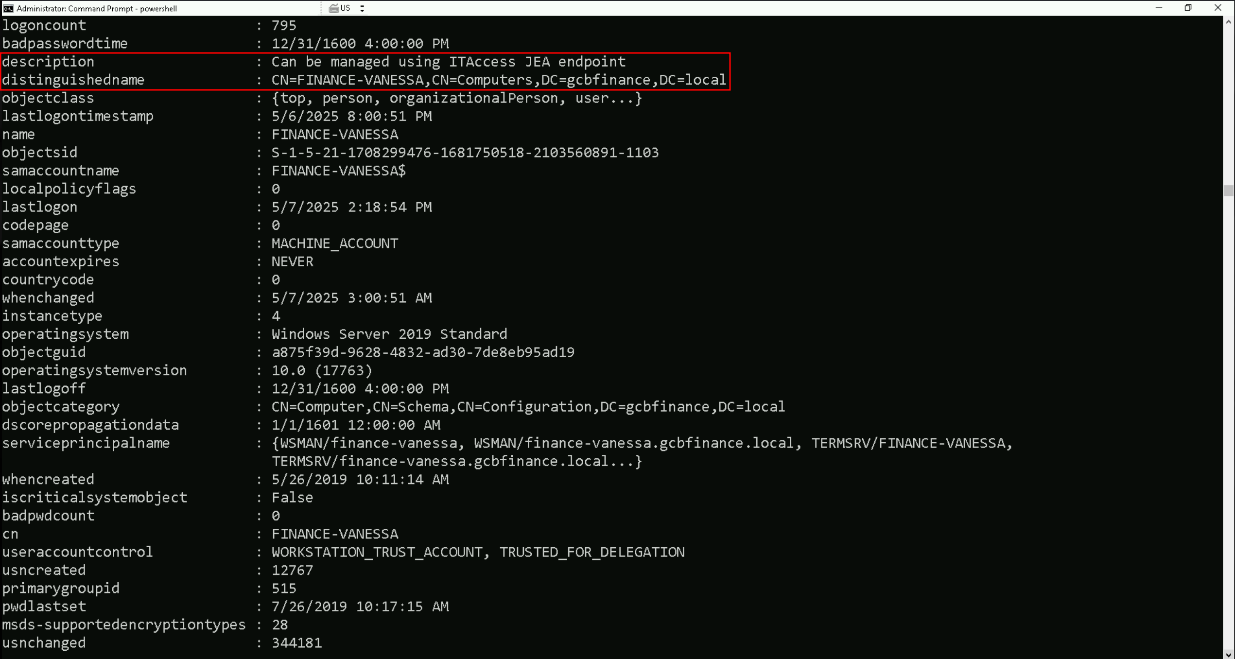 Another custom JEA endpoint. Like ITAccess it is PowerShell 5.1, but here RunAsUser is set to finance\vanessa-admin. Anyone who is able to open this endpoint will see their commands executed as that service account, not as themselves. The gate is tighter, though the only principals allowed to open the door are members of BUILTIN\Administrators. So you need to be an administrator first, then ITAdmin will run your session as vanessa-admin.
