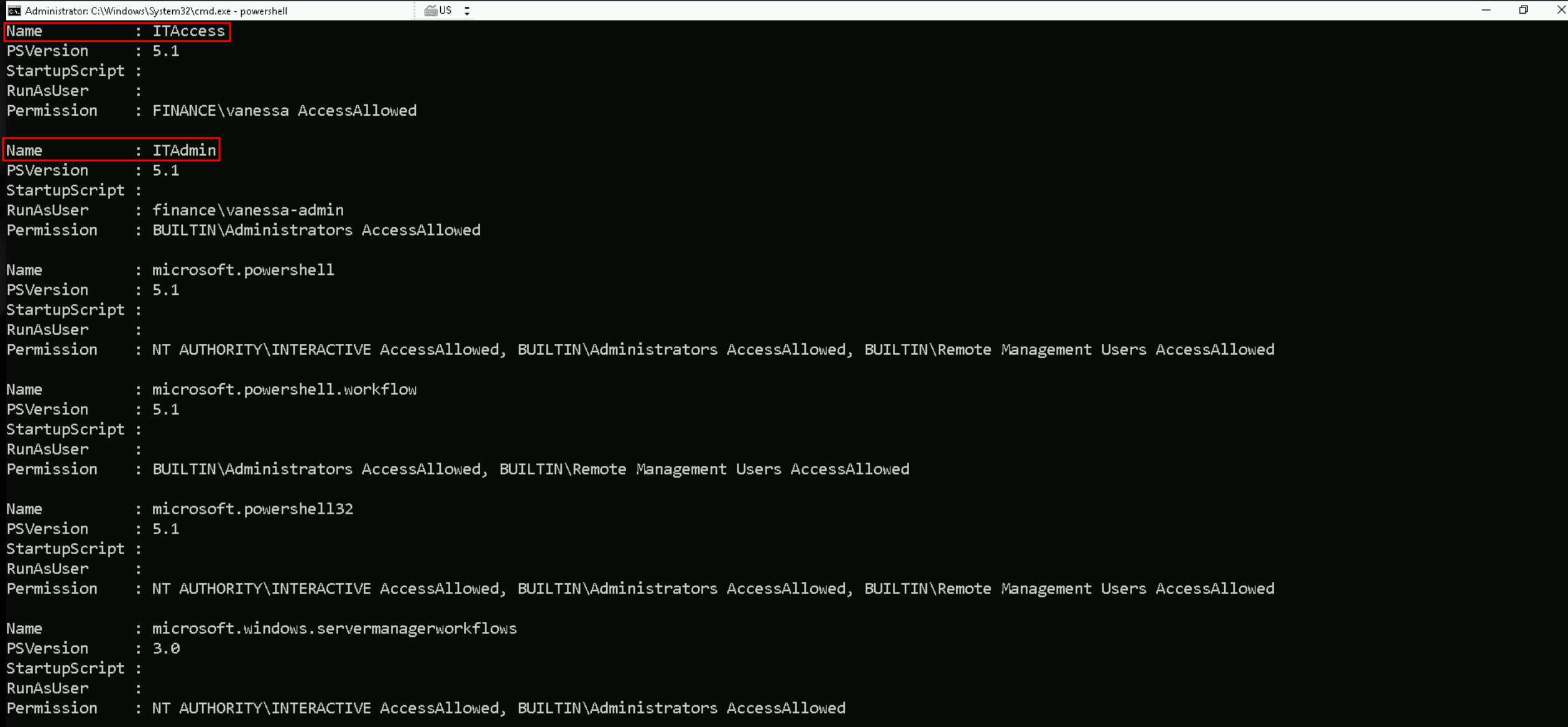 Get-PSSessionConfigurationshowed the machine hosts both custom JEA cages (ITAccess, ITAdmin) and the ordinary unrestricted shells (microsoft.powershell, microsoft.powershell32, …).