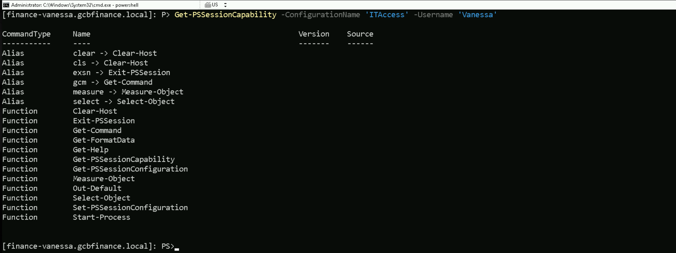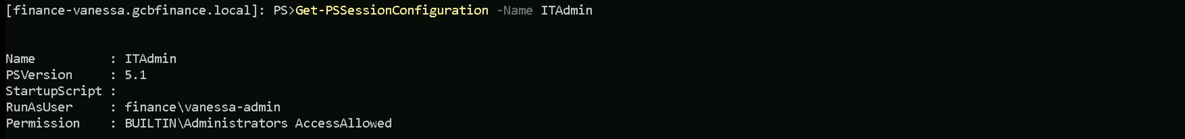 ITAccess is a custom JEA endpoint. It runs normal PowerShell 5.1 and it does not impersonate another account ( RunAsUser is empty ), so whatever commands it exposes will run in the caller’s own security context. The single permission entryFINANCE\vanessa AccessAllowedmeans that only the user vanessa can connect. In other words: ITAccess is a tiny cage built specifically for that one account.