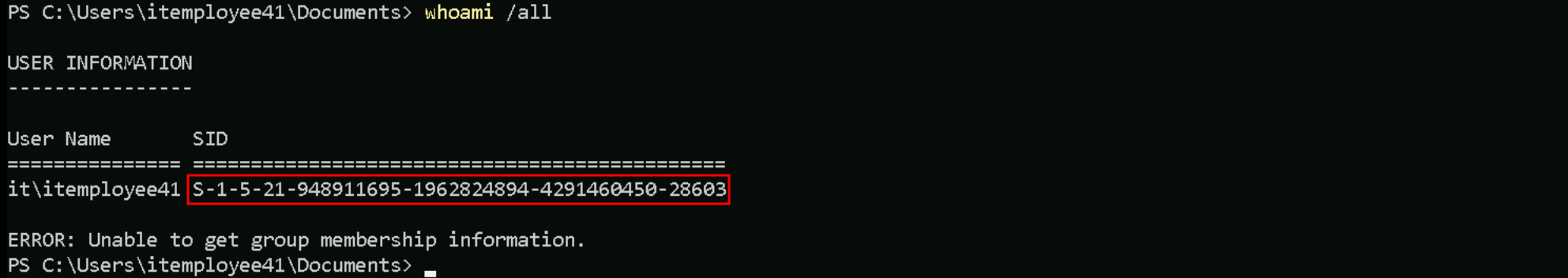 Touching microsoft.powershell32 would merely replace one limited shell with another, touching ITAdmin turns our low account into a higher-privilege service account without needing any further exploits. Before we move on, Let’s start by getting our user’s SID, in this case, Vanessa’s SID with a simplewhoami .