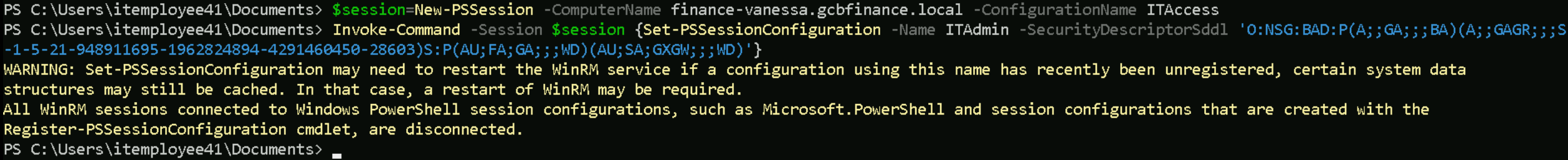 Invoke-Command -Session $session {Set-PSSessionConfiguration -Name ITAdmin -SecurityDescriptorSddl {'O:NSG:BAD:P(A;;GA;;;BA)(A;;GAGR;;;S-1-5-21-948911695-1962824894-4291460450-28603)S:P(AU;FA;GA;;;WD)(AU;SA;GXGW;;;WD)'}
