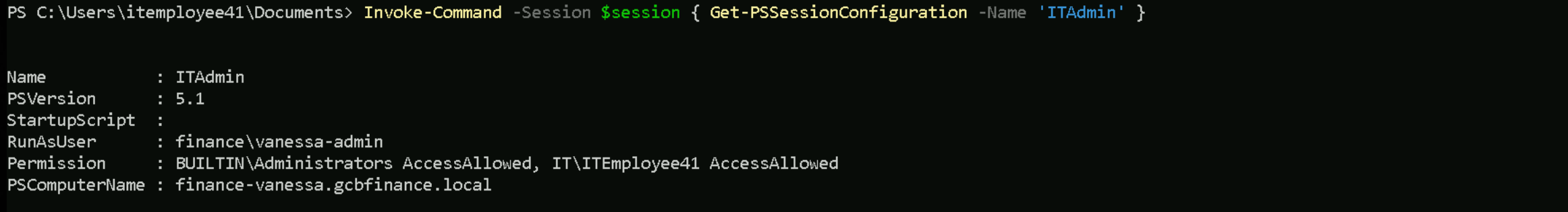 Invoke-Command -Session $session { Get-PSSessionConfiguration -Name 'ITAdmin' }