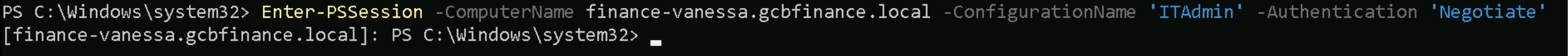 Enter-PSSession -ComputerName finance-vanessa.gcbfinance.local -ConfigurationName 'ITAdmin' -Authentication 'Negotiate'