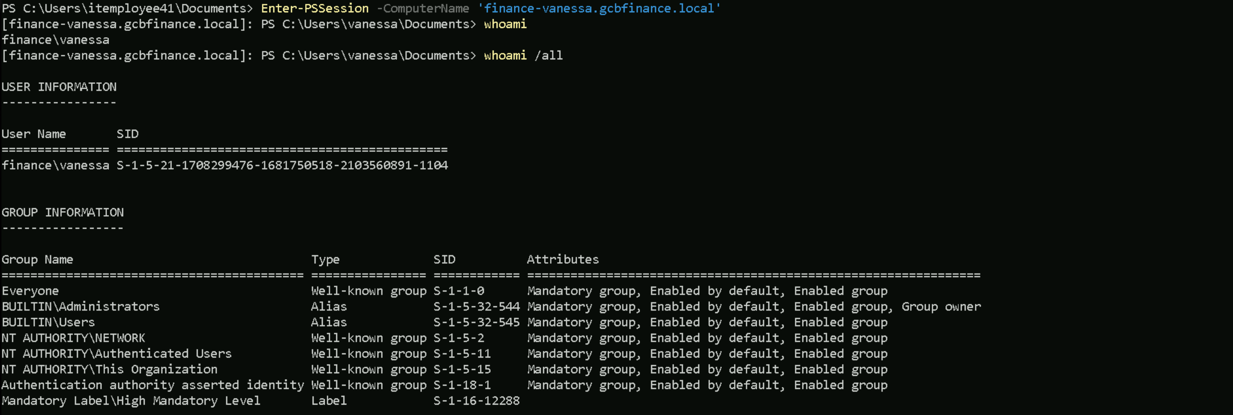 Now if we get back to our CMD session with vanessa’s TGT and we try to access finance-vanessa.gcbfinance.local’s host via PSRemoting, it will work and we see that we do have local Admin access.