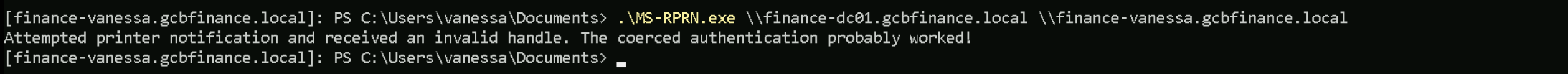 .\MS-RPRN.exe \\finance-dc01.gcbfinance.local \\finance-vanessa.gcbfinance.local