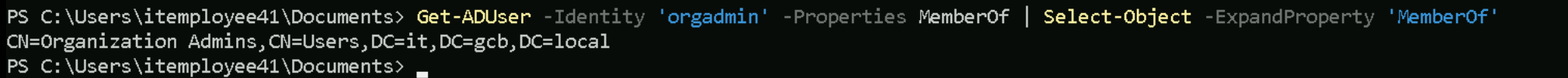 Get-ADUser -Identity 'orgadmin' -Properties MemberOf | Select-Object -ExpandProperty 'MemberOf'