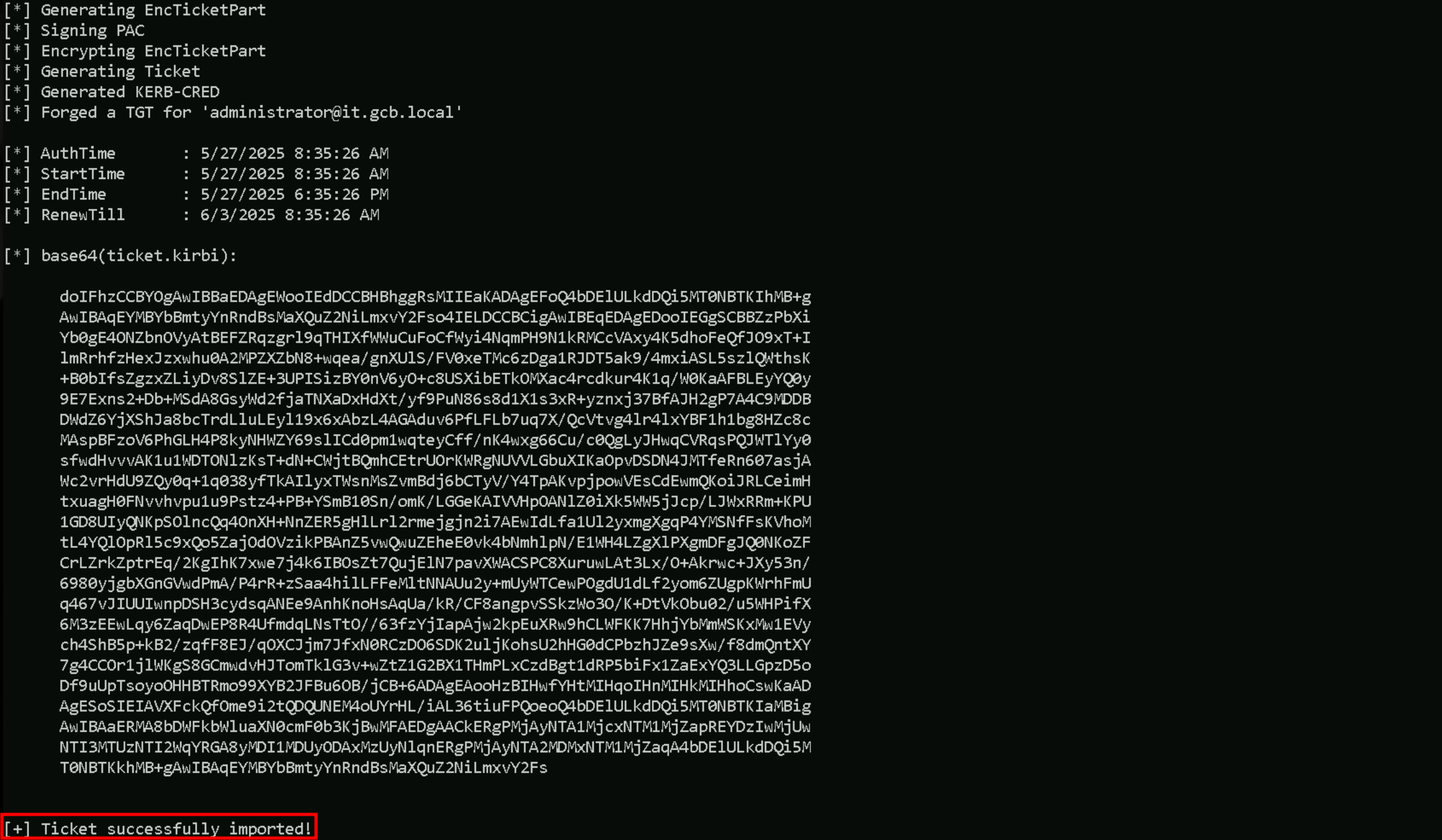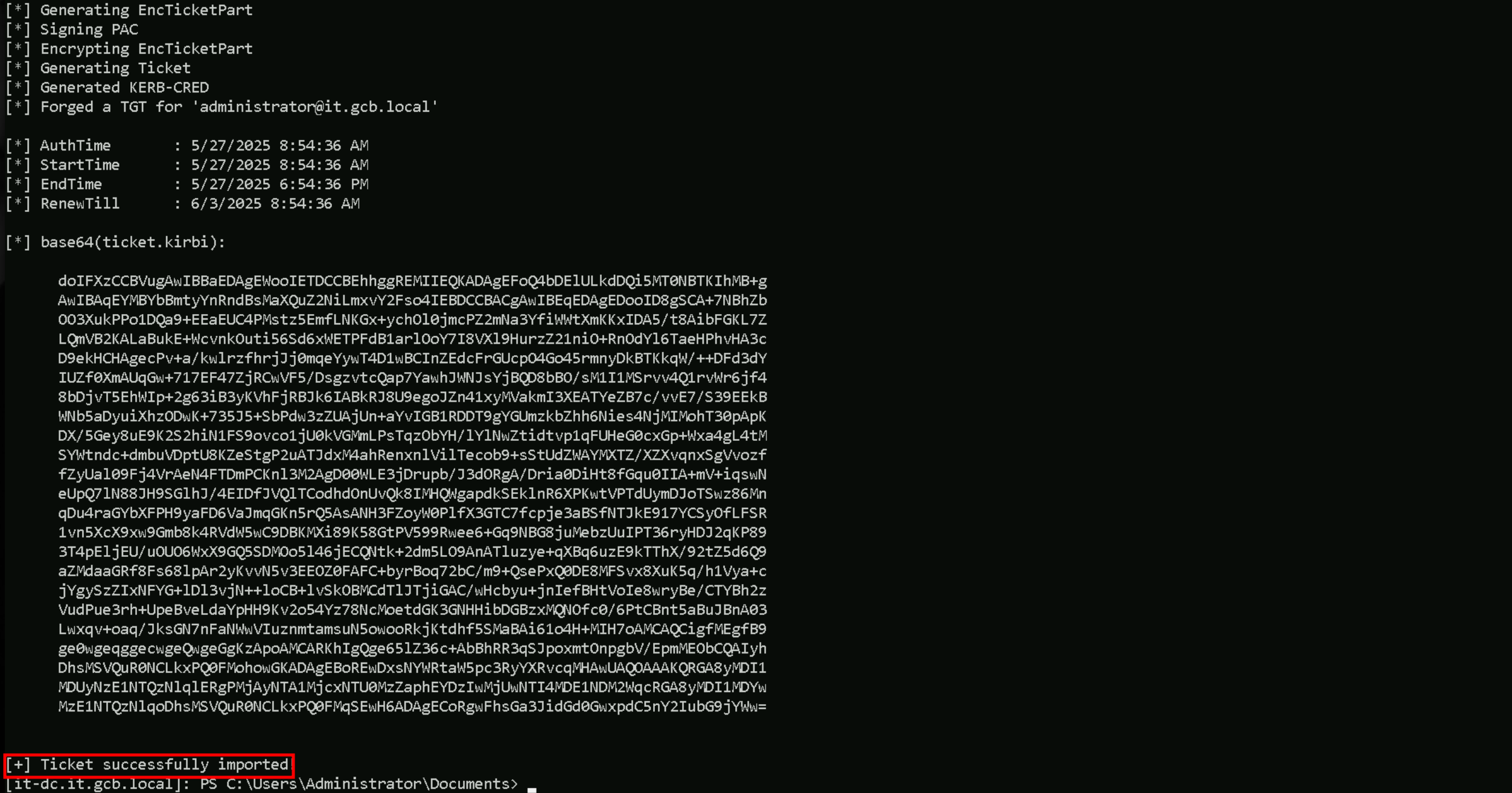 In this command, we forged a Golden Ticket in the child domain it.gcb.local for the administrator account and make it appear as if it belongs to the Enterprise Admins group from the forest root. We do this by injecting the Enterprise Admins SID from the root domain S-1-5-21-2781415573-3701854478-2406986946-519 using the /sids flag. This allows our forged TGT to be treated as if it has high-level privileges across the entire forest. We specify the child domain's SID with /sid, assign the Domain Users group with /groups:513, and use /ptt to inject the ticket directly into memory. By doing this, we escalate from a child domain compromise to forest-wide privilege, abusing SID history to make it possible.