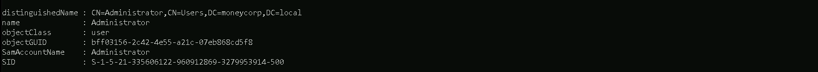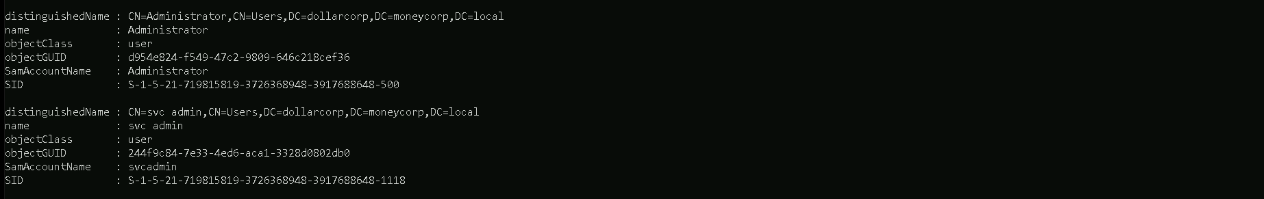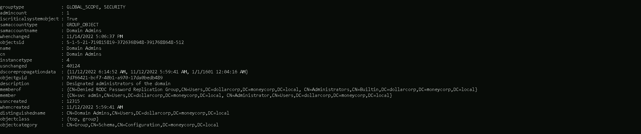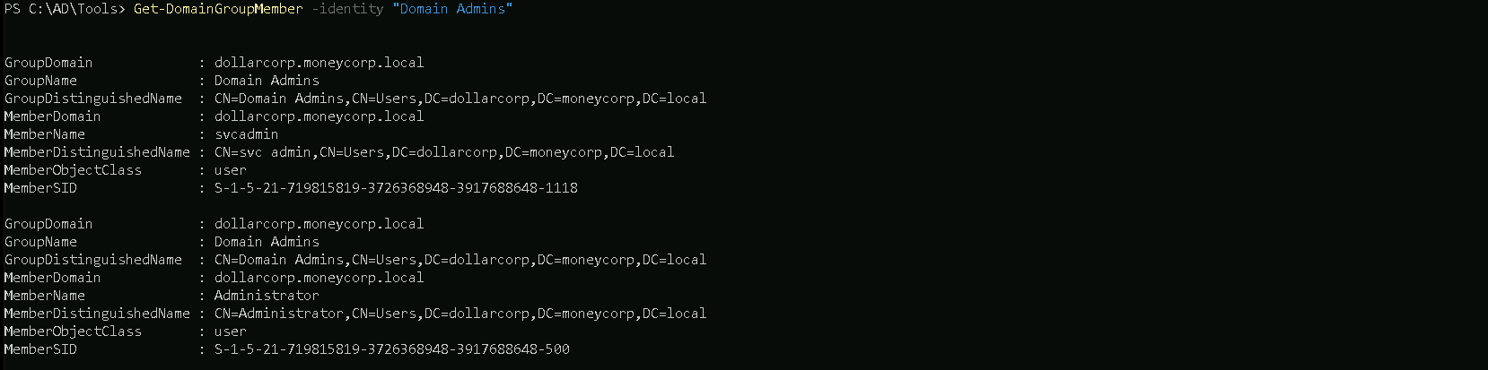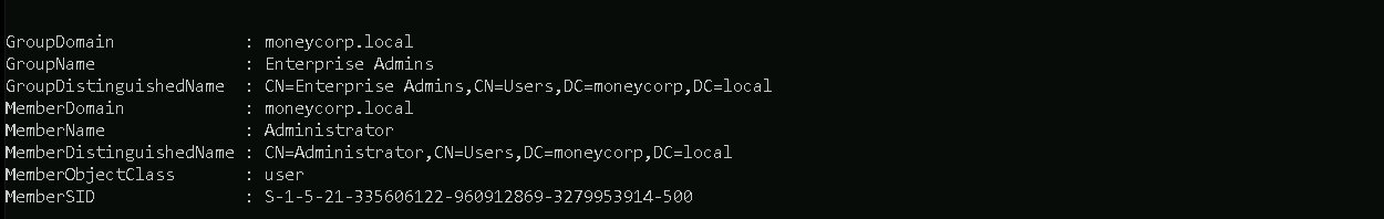 Enterprise Adminsgroup is present only in the root of a forest.Get-DomainGroupMember -Identity "Enterprise Admins" -Domain moneycorp.local
