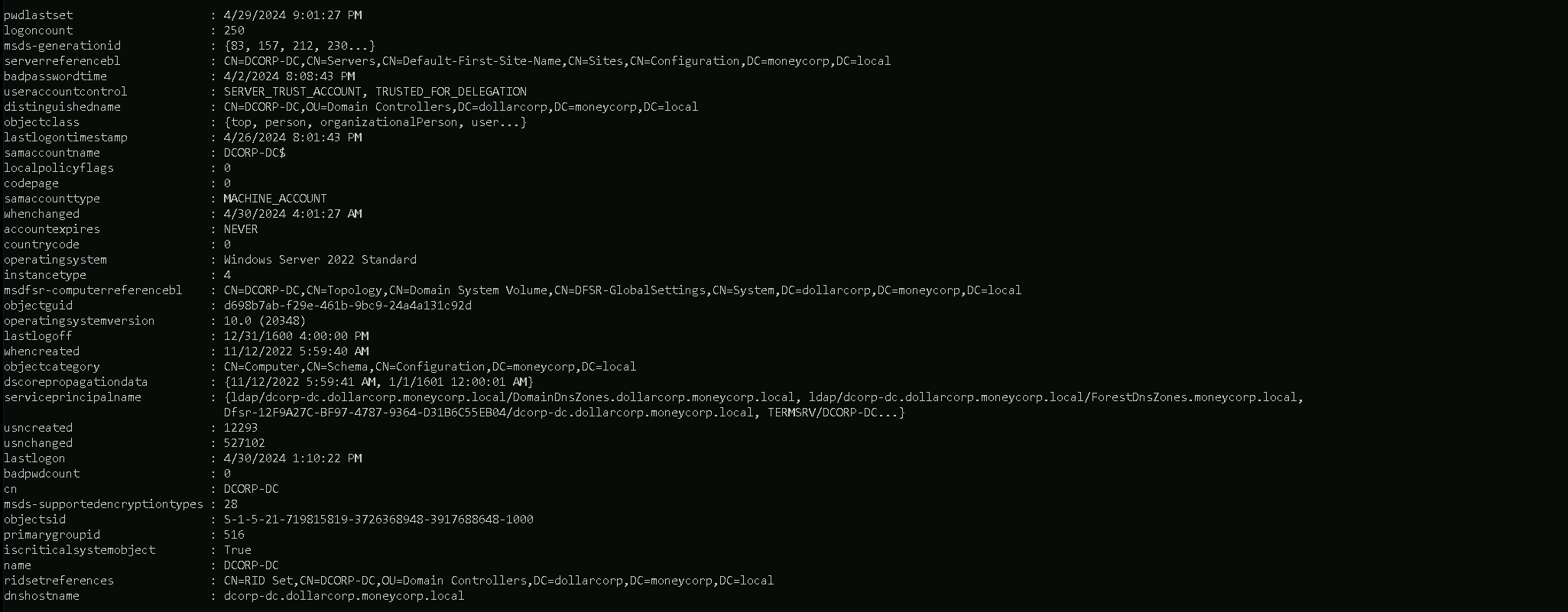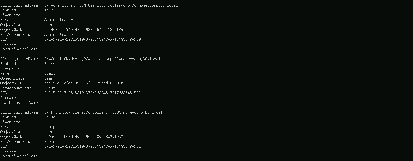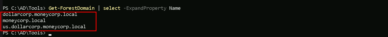 Meaning, the command below will allow us to get the external trusts from the root forest of our domain, in our case we are indollarcorp.moneycorp.local(which is a child domain from moneycorp.local)and with this command we can get only the external trusts instead of all the domains at the same time.Get-ForestDomain | {Get-DomainTrust -Domain $_.Name} | ?{$_Trust_Attributes -eq "FILTER_SIDS"}