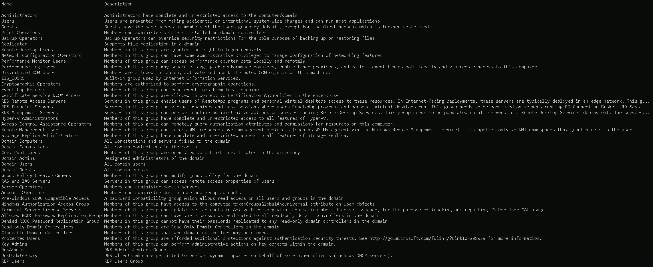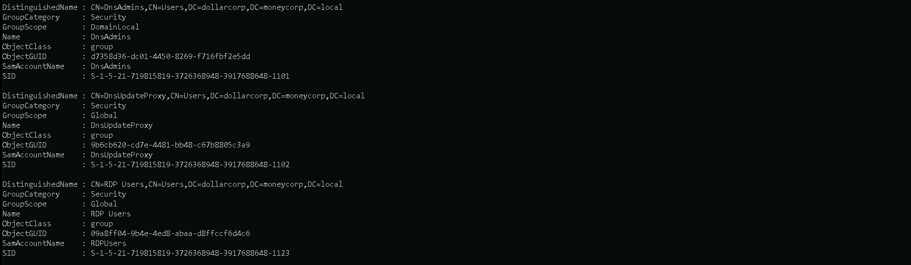Once we issue the command, we get all the groups available in this domain including all its properties.