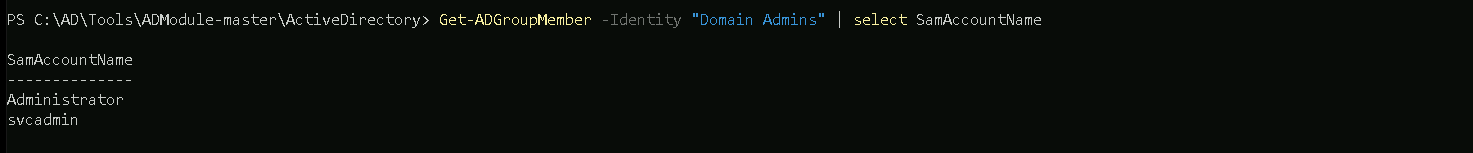 SamAccountNameproperty for all the Domain Admins group.Get-ADGroupMember -Identity "Domain Admins" | select SamAccountName,Description
