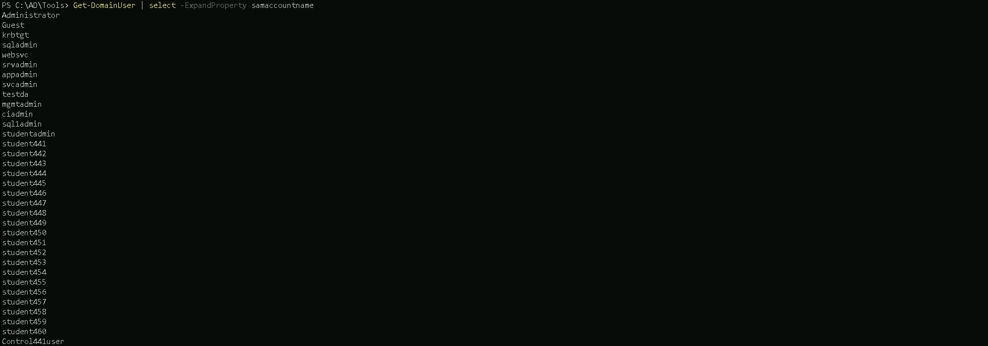 Let’s imagine we want to bring only the propertysamaccountname, which will brings us only account usernames.Get-DomainUSer | select -ExpandProperty samaccountname