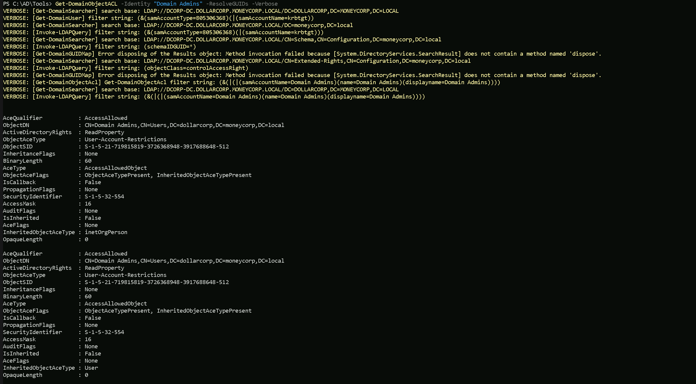 Domain Adminsgroup.Get-DomainObjectACL -Identity "Domain Admins" -ResolveGUIDs -Verbose